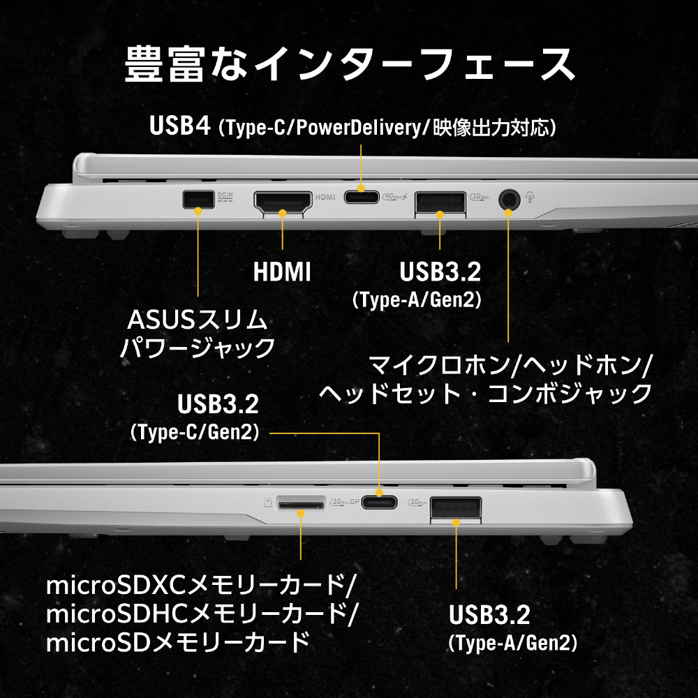 外部ディスプレイ出力:HDMI×1、Type-C×2 USBポート:USB4(Type-C/PowerDelivery対応)※1×1、USB3.2(Type-C/Gen2)※2×1、USB3.2(Type-A/Gen2)×2 ※1:データ転送と映像出力本機への給電をサポートしています。すべてのデバイスの動作を保証するものではありません。 ※2:データ転送と映像出力をサポートしています。すべてのデバイスの動作を保証するものではありません。本機への給電はサポートしていません。