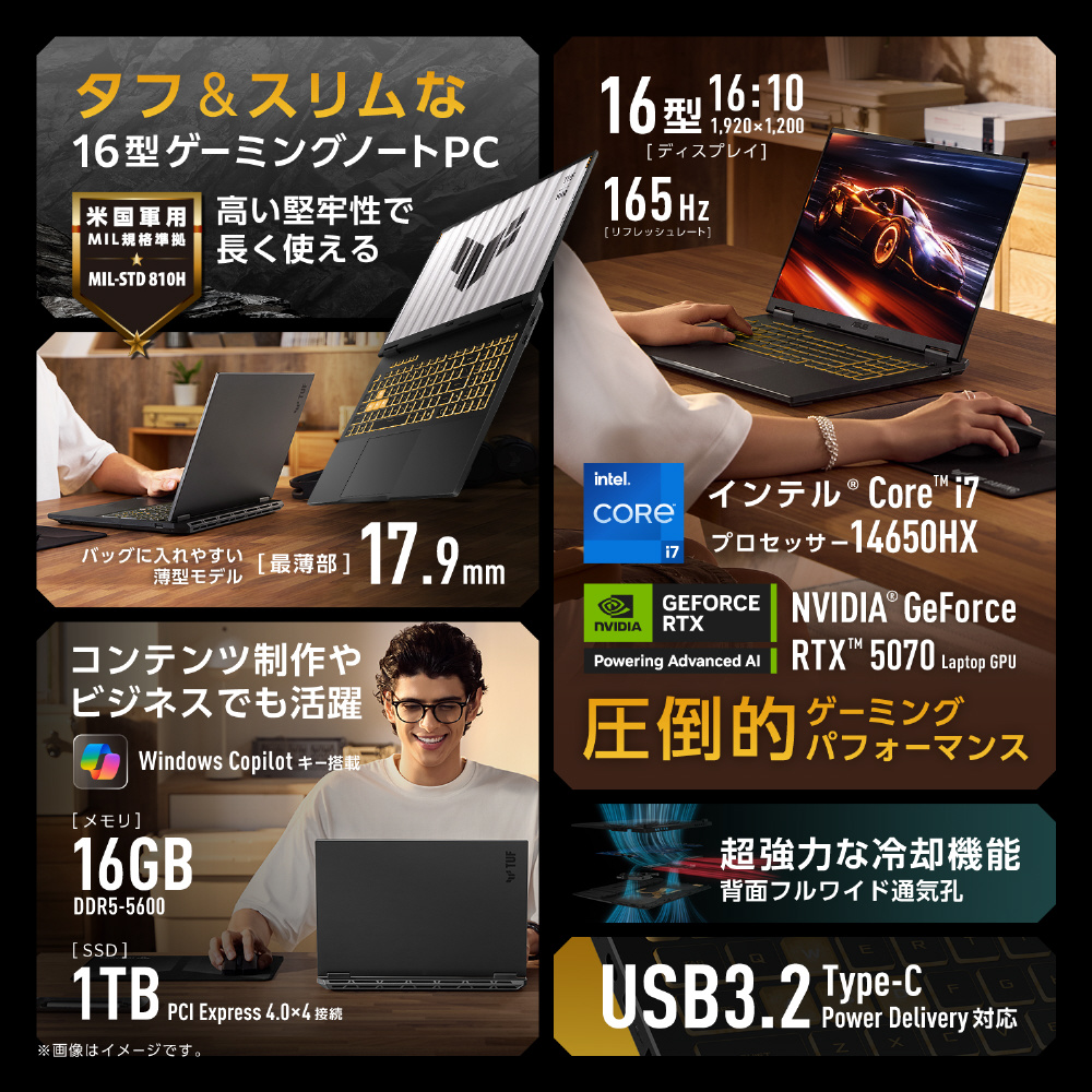 FX608JPR-I7R507016G ゲーミングノートパソコン TUF Gaming F16(RTX 5070) イェーガーグレー [16.0型 /Windows11 Home /intel Core i7 /メモリ:16GB /SSD:1TB /無し /日本語版キーボード /2026年4月モデル]