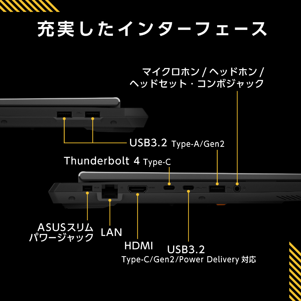 ディスプレイ出力:HDMI×1、Type-C×2 USBポート:Thunderbolt4(Type-C)※1×1、USB3.2(Type-C/Gen2/PowerDelivery対応)※2×1、USB3.2(Type-A/Gen2)×3 ※1:データ転送と映像出力をサポートしています。すべてのデバイスの動作を保証するものではなく本機への給電はサポートしていません。 ※2データ転送と映像出力本機への給電をサポートしています。すべてのデバイスの動作を保証するものではありません。