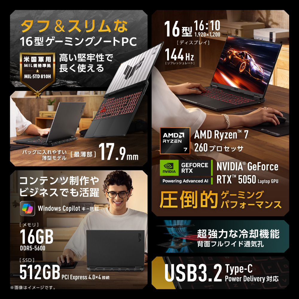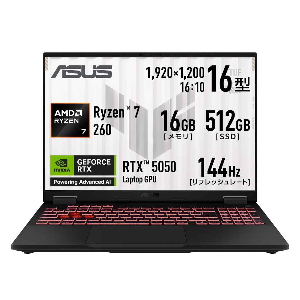 FA608UHI-R7R5050 ゲーミングノートパソコン TUF Gaming A16(RTX 5050) イェーガーグレー [16.0型 /Windows11 Home /AMD Ryzen 7 /メモリ:16GB /SSD:512GB /無し /日本語版キーボード /2026年4月モデル]