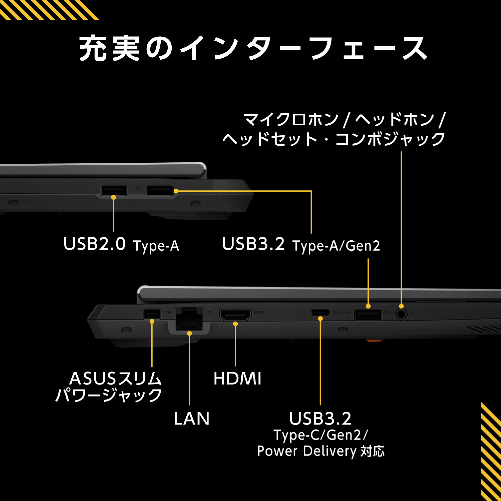 外部ディスプレイ出力:HDMI×1、Type-C×1 USBポート:USB3.2 (Type-C/Gen2/Power Delivery対応) ※×1、USB3.2 (Type-A/Gen2) ×2、USB2.0 (Type-A) ×1 ※データ転送と映像出力、本機への給電をサポートしています。すべてのデバイスの動作を保証するものではありません。 オーディオ:マイクロホン/ヘッドホン・コンボジャック×1