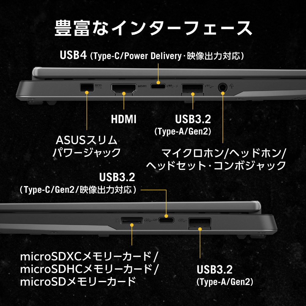 外部ディスプレイ出力:HDMI×1、Type-C×2 USBポート:USB4(Type-C/PowerDelivery対応)※1×1、USB3.2(Type-C/Gen2)※2×1、USB3.2(Type-A/Gen2)×2 ※1:データ転送と映像出力本機への給電をサポートしています。すべてのデバイスの動作を保証するものではありません。 ※2:データ転送と映像出力をサポートしています。すべてのデバイスの動作を保証するものではありません。本機への給電はサポートしていません。