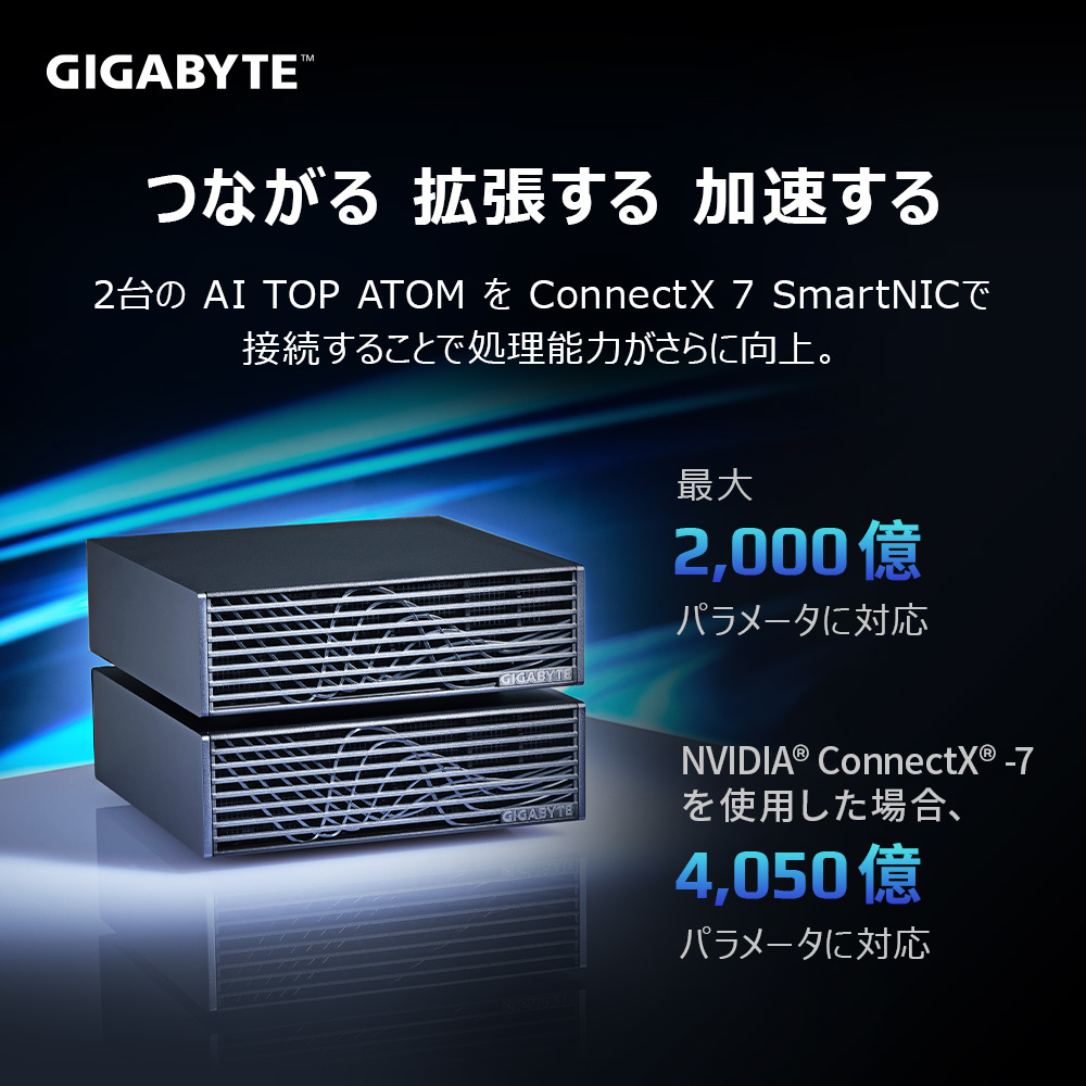 強力なローカル処理能力により、パラメータ数の多い生成系AIモデルもスムーズに扱うことができます。さらに2台のAI TOP ATOMをConnectX 7 SmartNICで接続することでより高度なAIモデルへの対応やAIワークロードのスケーリング(拡張)も可能になります。