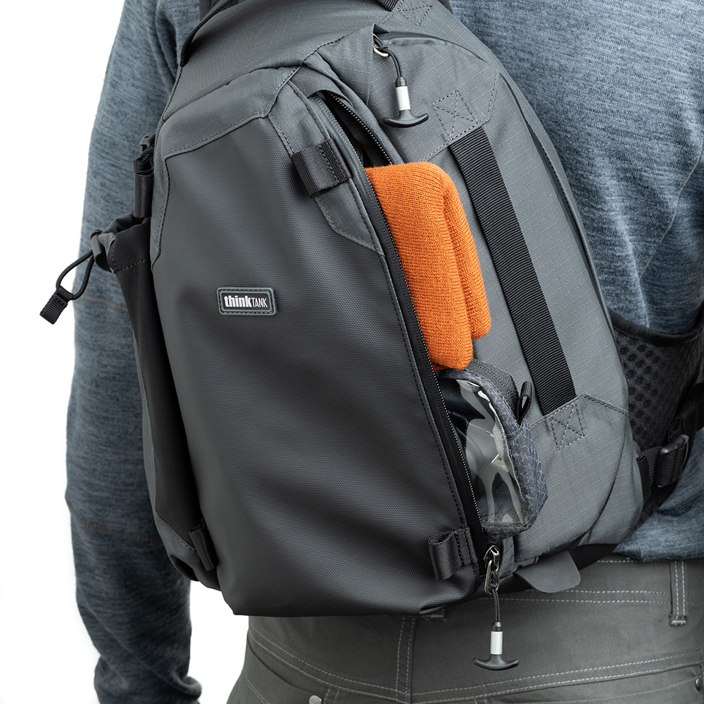 バッグを背中から前面へ素早く回転させるだけで、サイドパネルから機材を取り出せる「スウィングアクセス構造」を採用。バッグを地面に下ろす手間を省き、決定的なシャッターチャンスを逃しません。