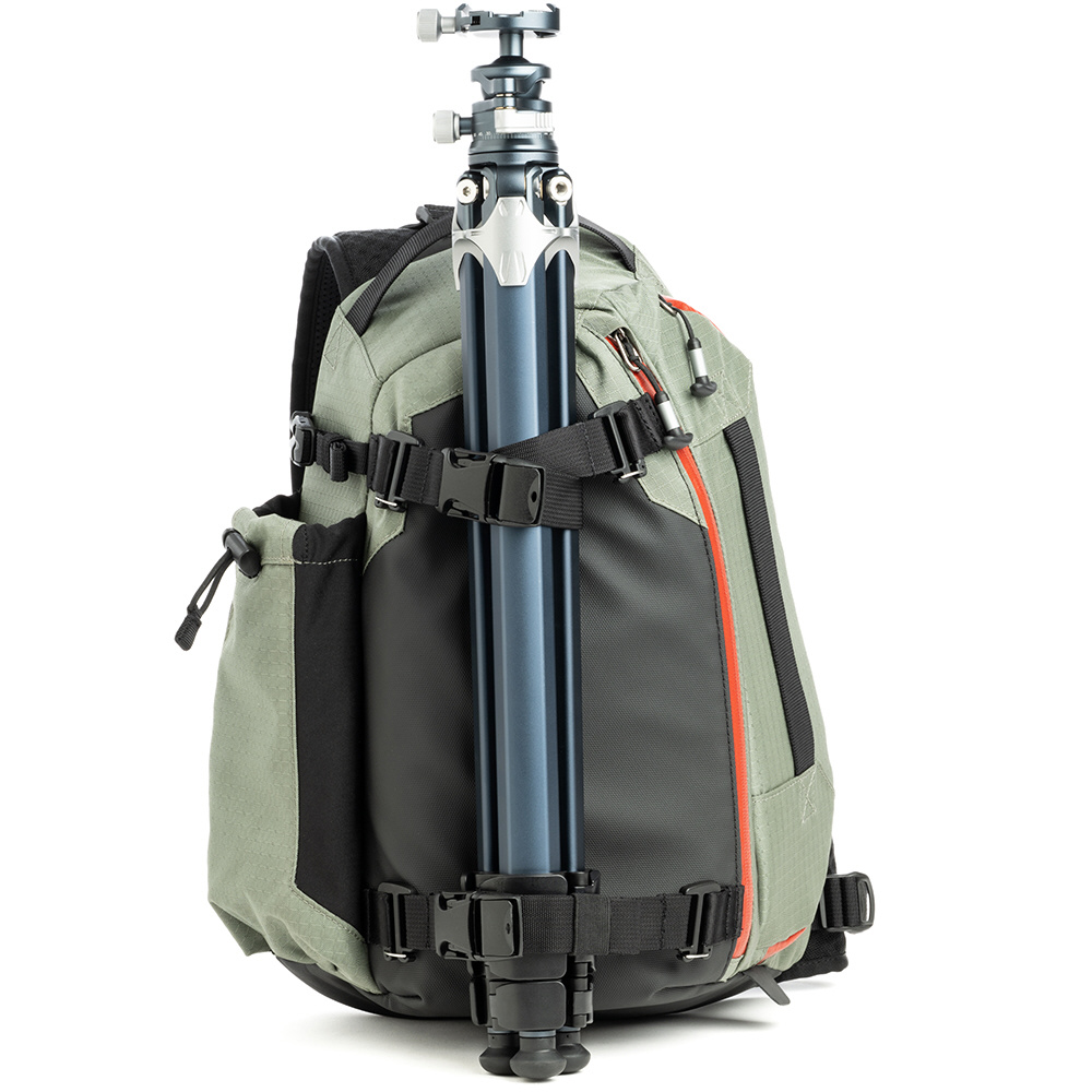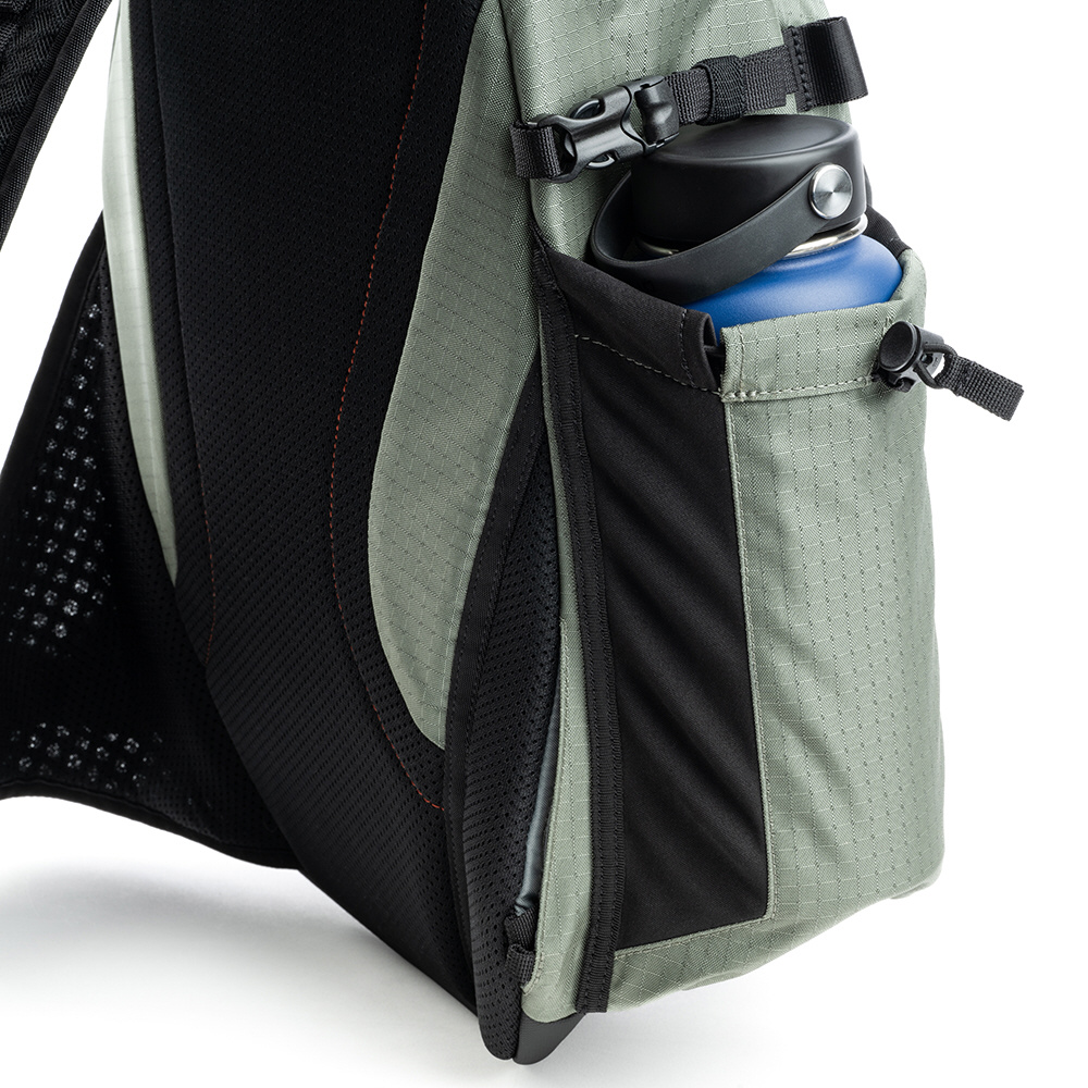 メイン開口部にはYKK製止水ファスナー(AquaGuardR)を採用。本体素材には、環境に配慮したPFASフリーの耐久撥水(DWR)コーティングを施し、シームレスなCORDURAR(コーデュラ)ナイロン製のベースおよびフロントパネルを組み合わせています。また、悪天候時に機材を完全に保護するシームシール処理済みレインカバーも標準装備しています。
