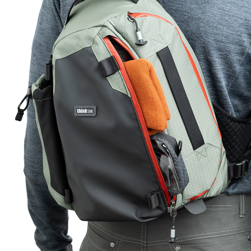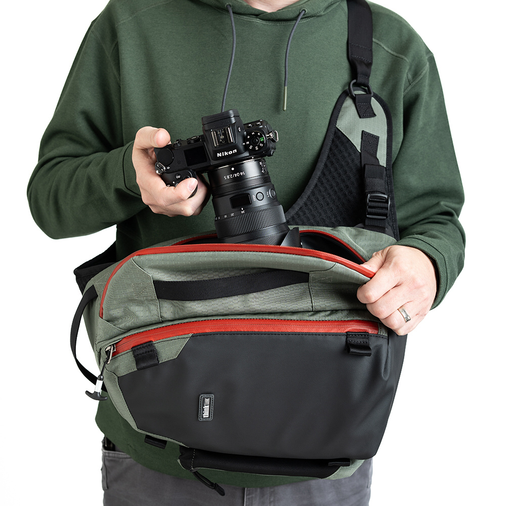 バッグを背中から前面へ素早く回転させるだけで、サイドパネルから機材を取り出せる「スウィングアクセス構造」を採用。バッグを地面に下ろす手間を省き、決定的なシャッターチャンスを逃しません。