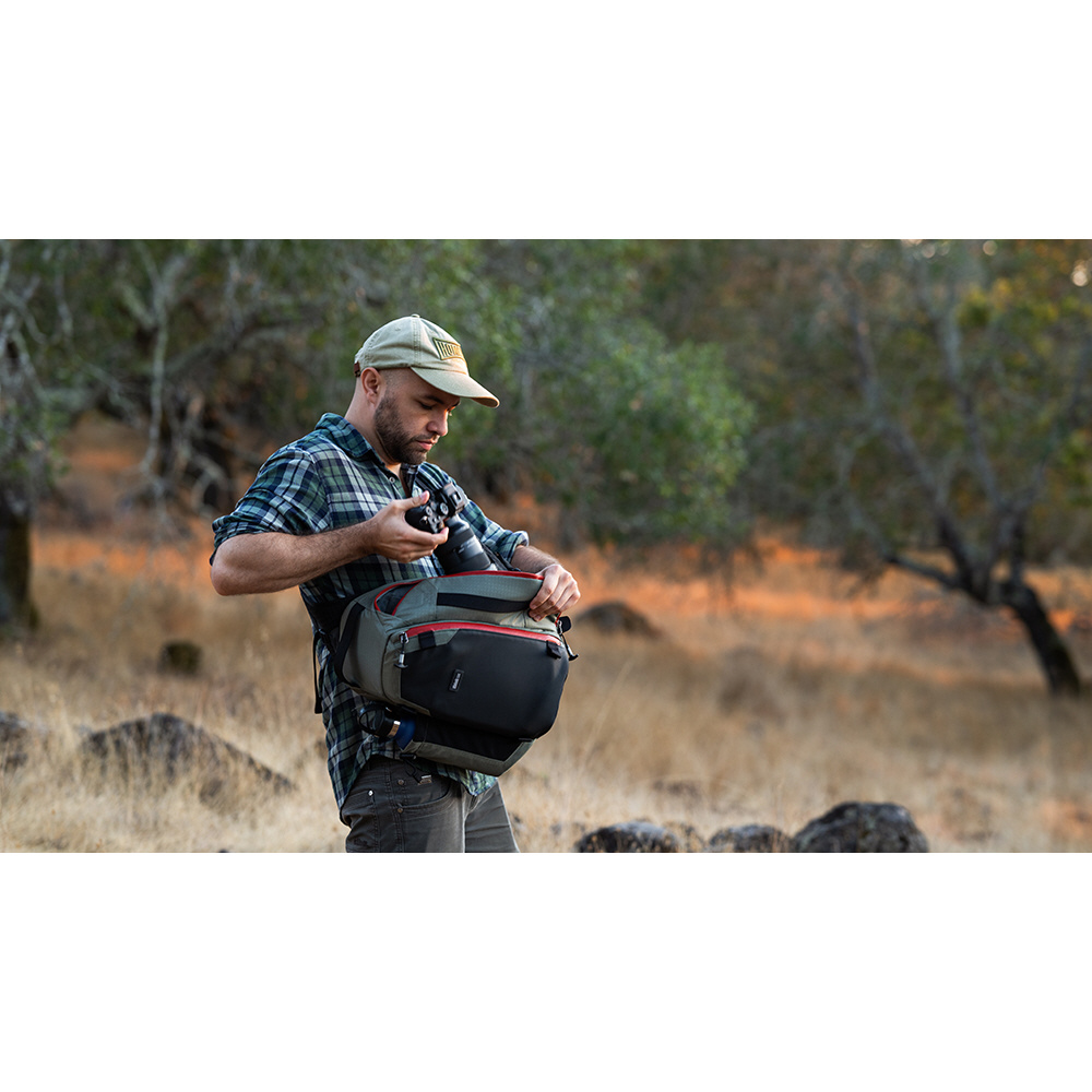 バッグを背中から前面へ素早く回転させるだけで、サイドパネルから機材を取り出せる「スウィングアクセス構造」を採用。バッグを地面に下ろす手間を省き、決定的なシャッターチャンスを逃しません。