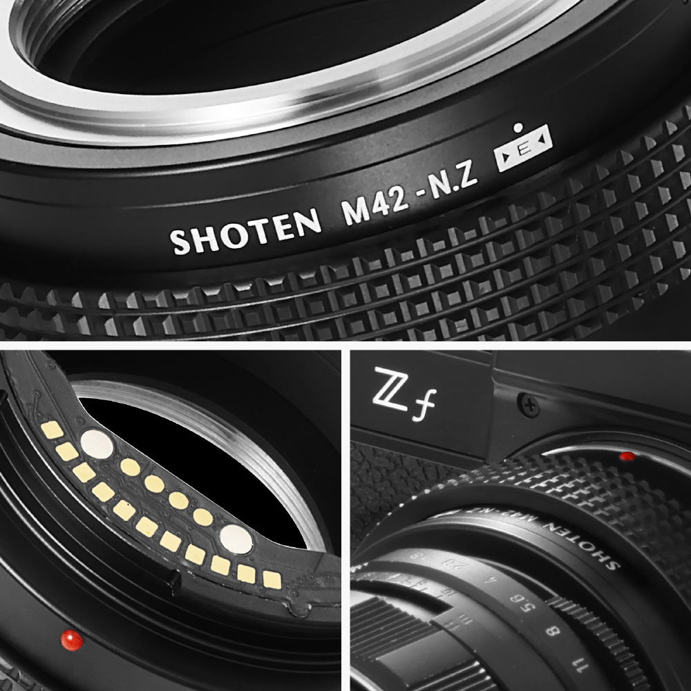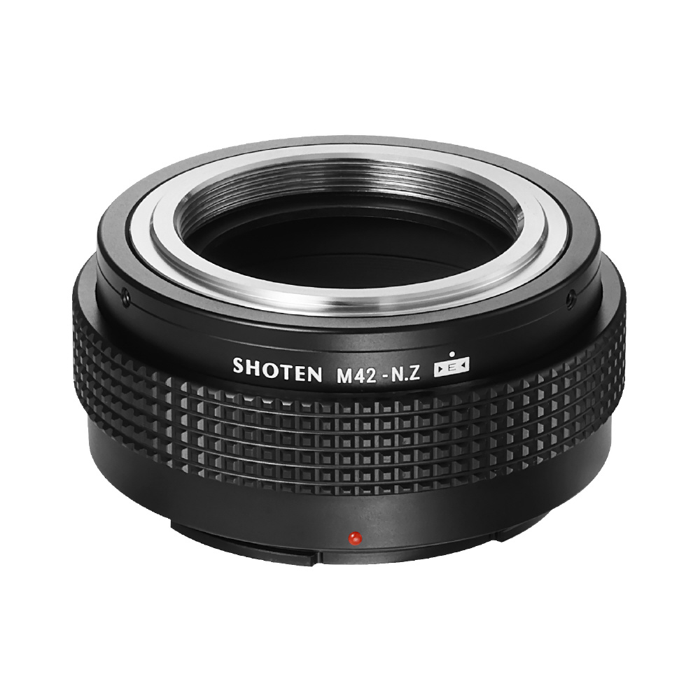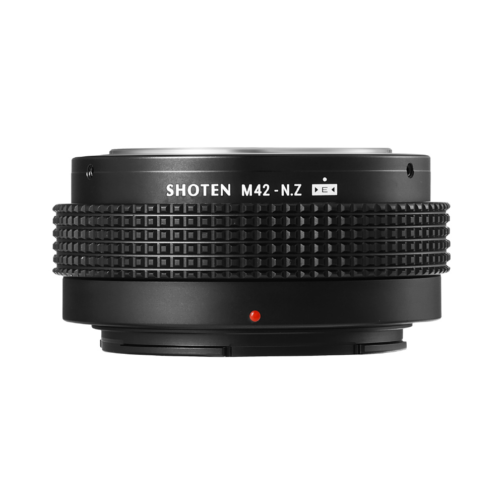 SHOTEN(ショウテン)M42-NZ-Eは、M42マウントレンズをニコンZマウントのカメラで使用するための電子接点付きマウント変換アダプターです。焦点距離や開放F値などのレンズ情報をカメラへ伝達し、EXIF記録およびフォーカスエイド機能に対応します(AFおよび自動絞り制御非対応)。オールドレンズを含む多彩なレンズ資産を、ニコンZマウント機でより快適に活用したいユーザーに適した製品です。