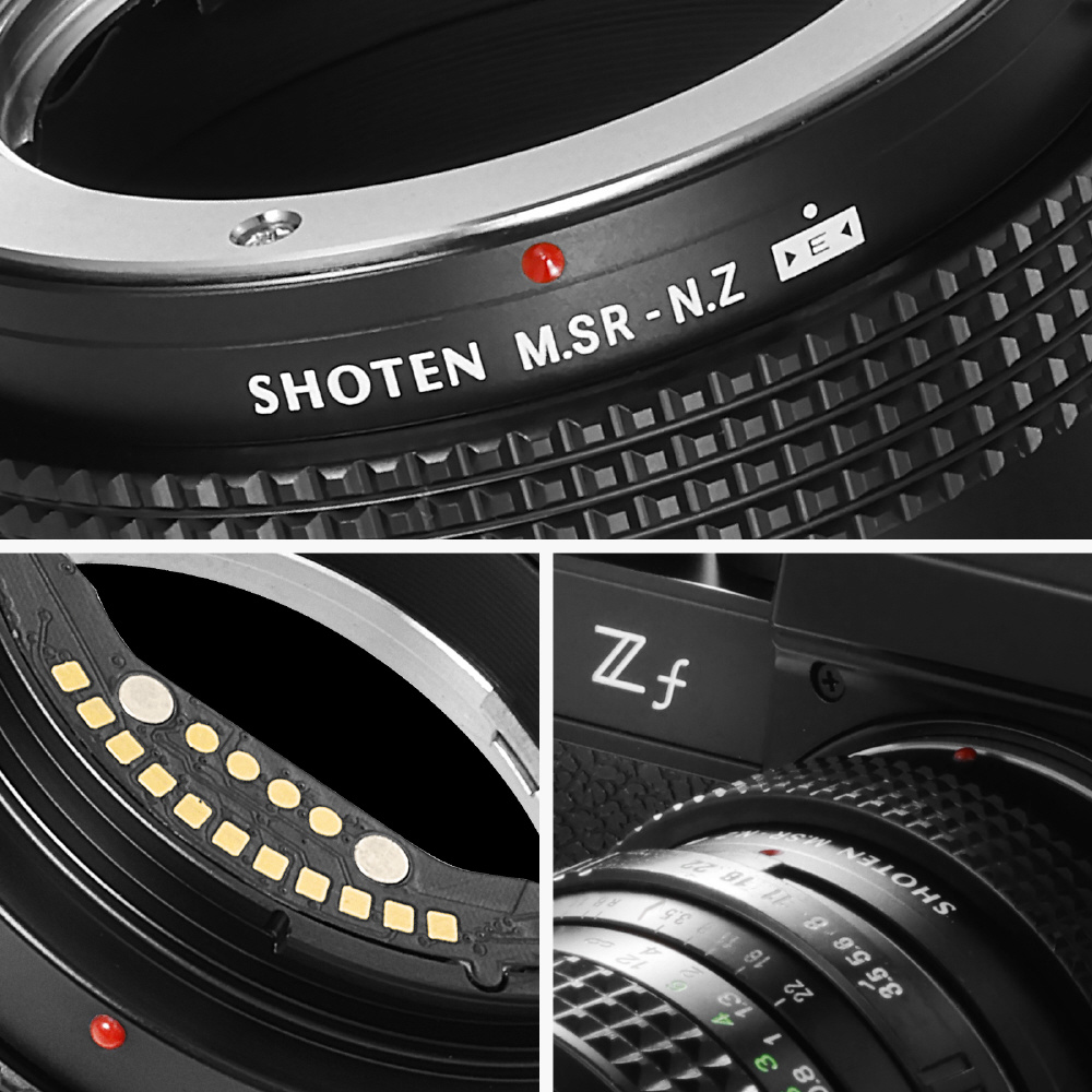 SHOTEN(ショウテン)MSR-NZ-Eは、ミノルタMD・MC|SRマウントレンズをニコンZマウントのカメラで使用するための電子接点付きマウント変換アダプターです。焦点距離や開放F値などのレンズ情報をカメラへ伝達し、EXIF記録およびフォーカスエイド機能に対応します(AFおよび自動絞り制御非対応)。オールドレンズを含む多彩なレンズ資産を、ニコンZマウント機でより快適に活用したいユーザーに適した製品です。