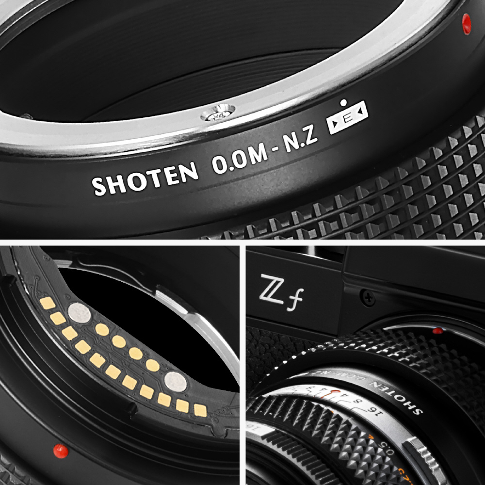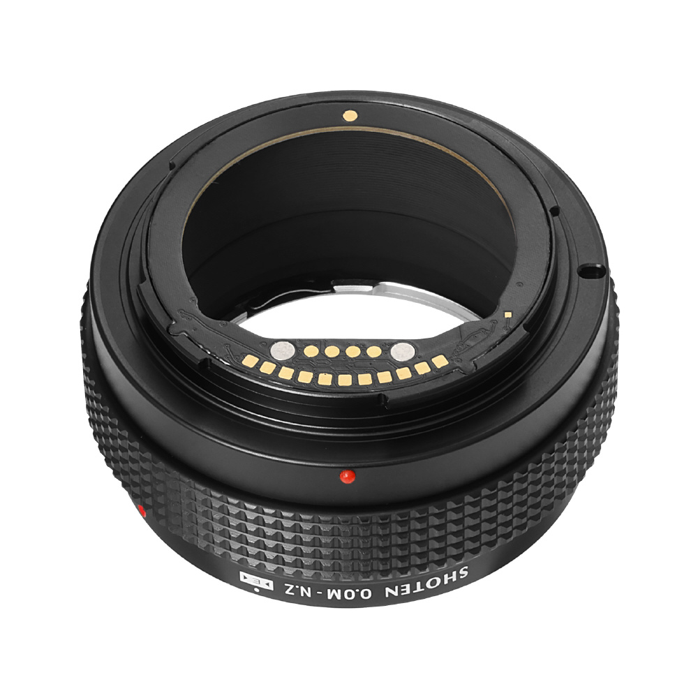 SHOTEN(ショウテン)OOM-NZ-Eは、オリンパスOMマウントレンズをニコンZマウントのカメラで使用するための電子接点付きマウント変換アダプターです。焦点距離や開放F値などのレンズ情報をカメラへ伝達し、EXIF記録およびフォーカスエイド機能に対応します(AFおよび自動絞り制御非対応)。オールドレンズを含む多彩なレンズ資産を、ニコンZマウント機でより快適に活用したいユーザーに適した製品です。