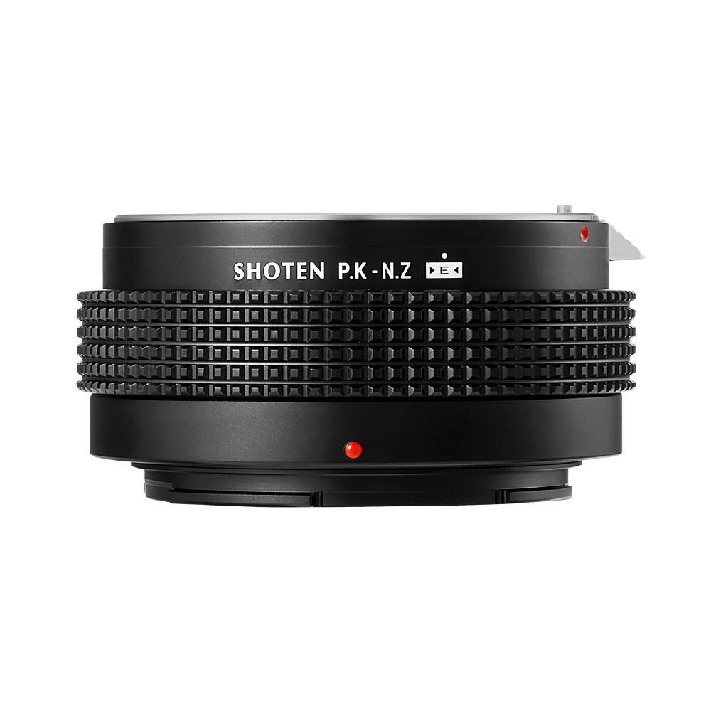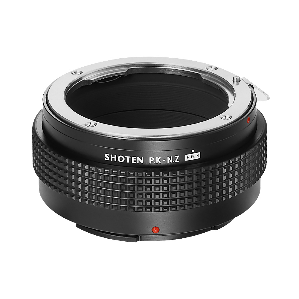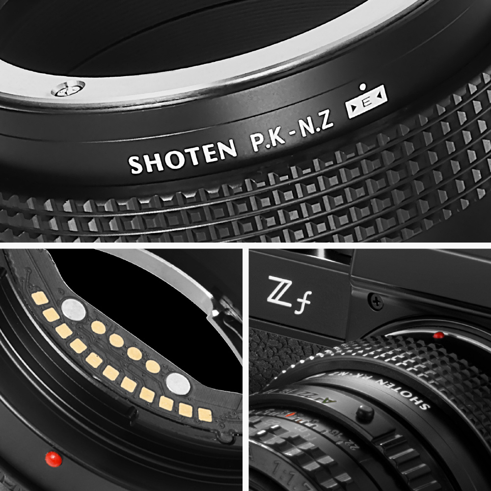 SHOTEN(ショウテン)PK-NZ-Eは、ペンタックスKマウントレンズをニコンZマウントのカメラで使用するための電子接点付きマウント変換アダプターです。焦点距離や開放F値などのレンズ情報をカメラへ伝達し、EXIF記録およびフォーカスエイド機能に対応します(AFおよび自動絞り制御非対応)。オールドレンズを含む多彩なレンズ資産を、ニコンZマウント機でより快適に活用したいユーザーに適した製品です。