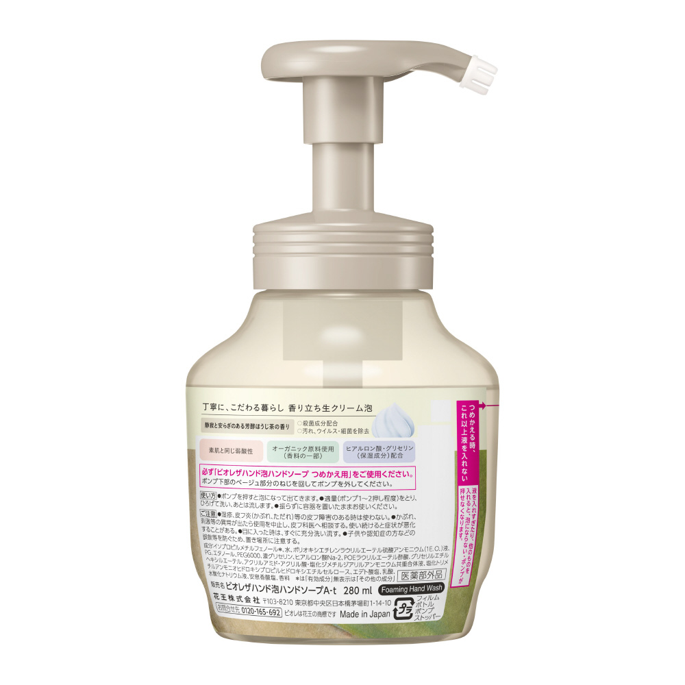 丁寧な暮らしに溶け込む、こだわりのハンドソープ。香り立ち生クリーム泡。(医薬部外品) ●オーガニック原料使用(香料の一部) ●素肌と同じ弱酸性 ●ヒアルロン酸・グリセリン(保湿成分)配合 ●超微細な生クリーム泡を作る3層メッシュポンプ採用 ●殺菌成分配合 ●汚れ、ウイルス・細菌を除去 ●こだわりの暮らしに 静寂と安らぎのある芳醇ほうじ茶の香り