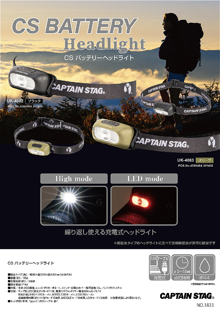 明るさ:(約)HIGH=100ルーメン、MIDDLE=50ルーメン、LOW=30ルーメン