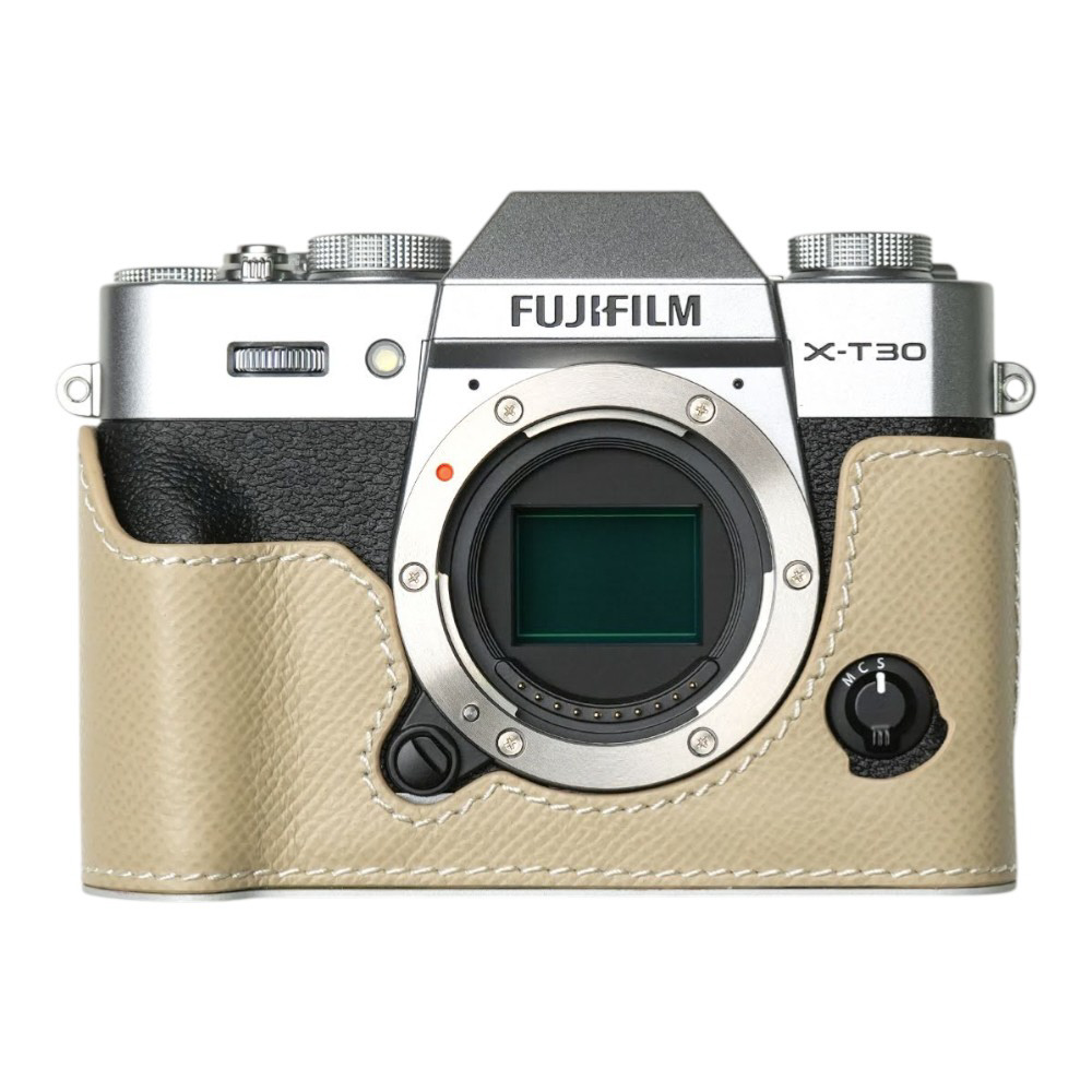 【受注生産】富士フイルムX-T30 III用 本革ケース ライトベージュ/白ステッチ