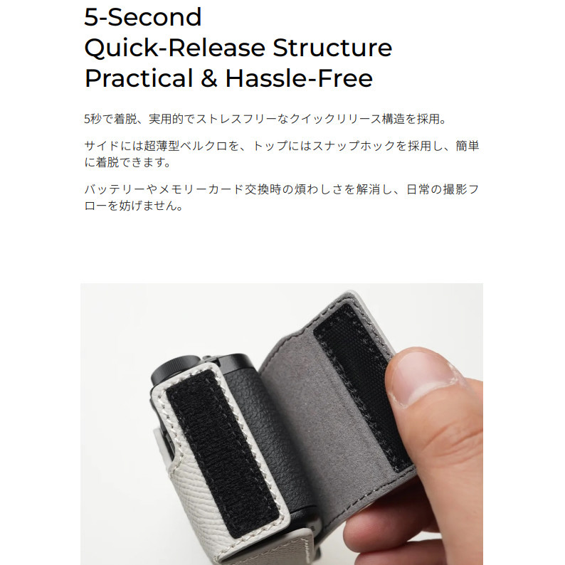サイドには超薄型ベルクロを、トップにはスナップホックを採?し、約5秒で簡単に着脱できますので、バッテリーやメモリーカード交換時の煩わしさを解消し、?常の撮影フローを妨げません。