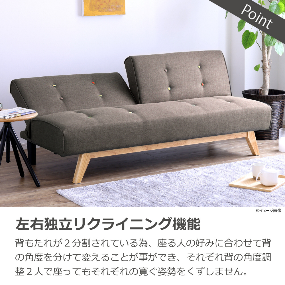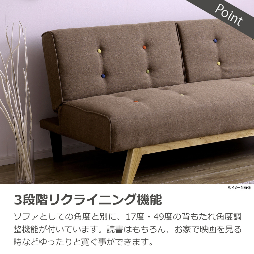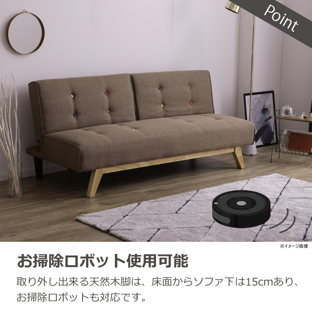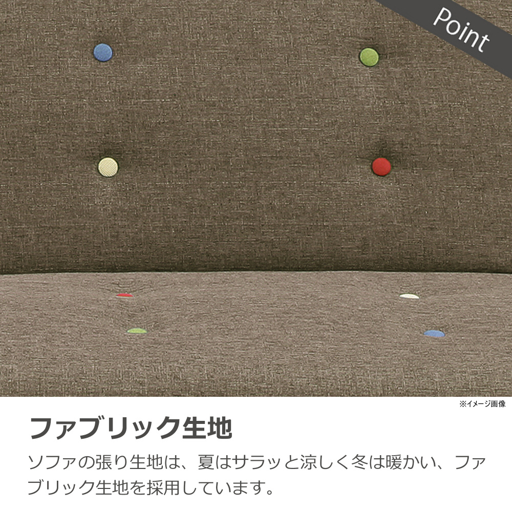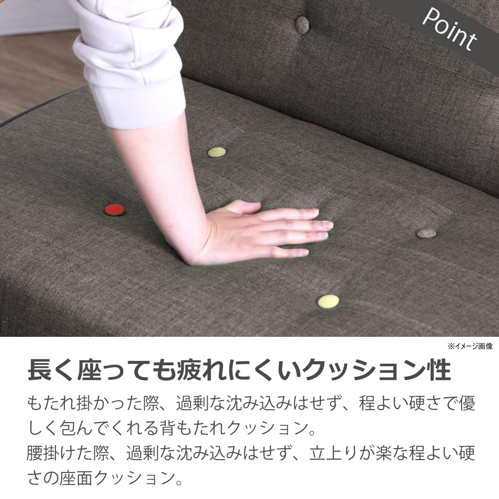 背もたれと座面にあしらったカラフルなボタンと天然木の前足がアクセントになっています。