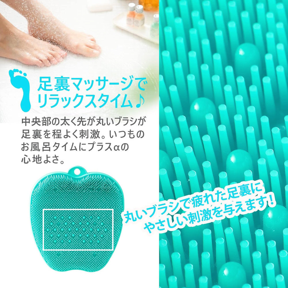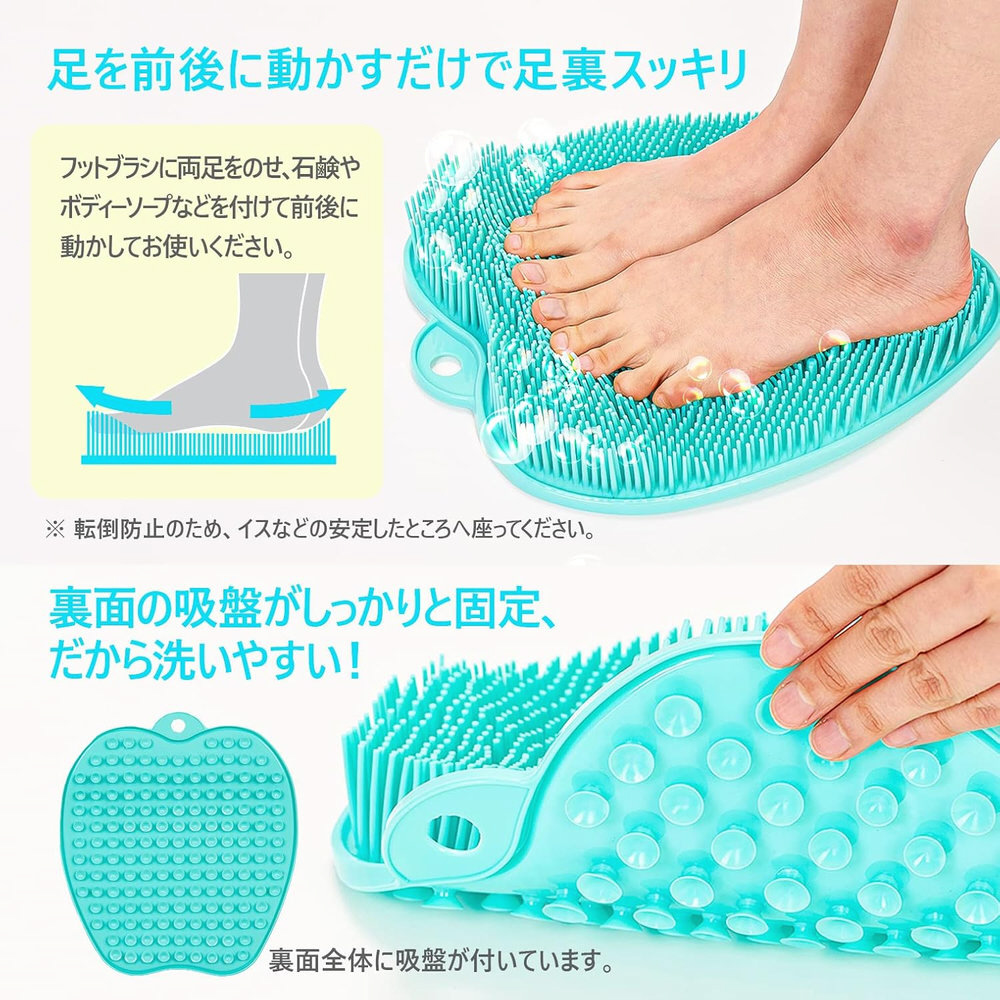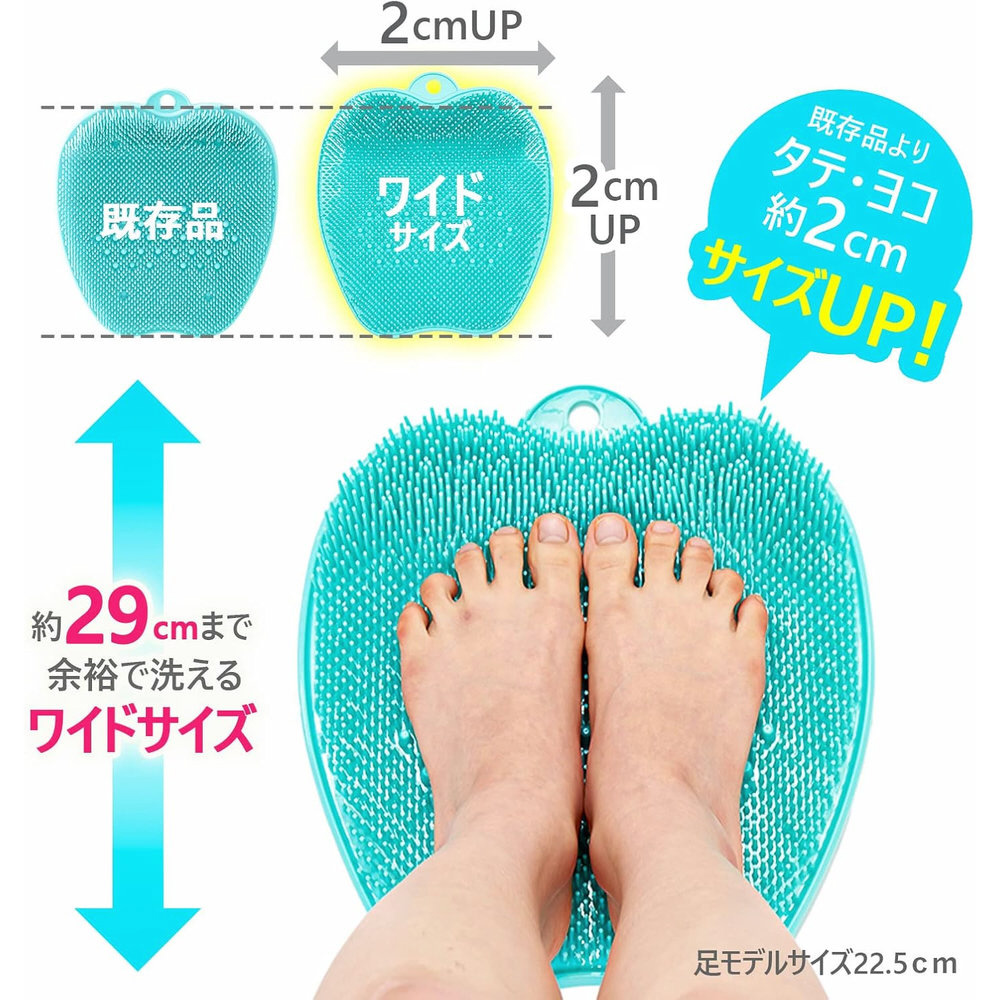 従来品より縦横ワイドに。ソープを泡立てて足を前後に動かすだけで足裏を気持ちよく刺激しながら洗えます。長さの違うブラシが足の指先までしっかりっと入り込み洗えます。