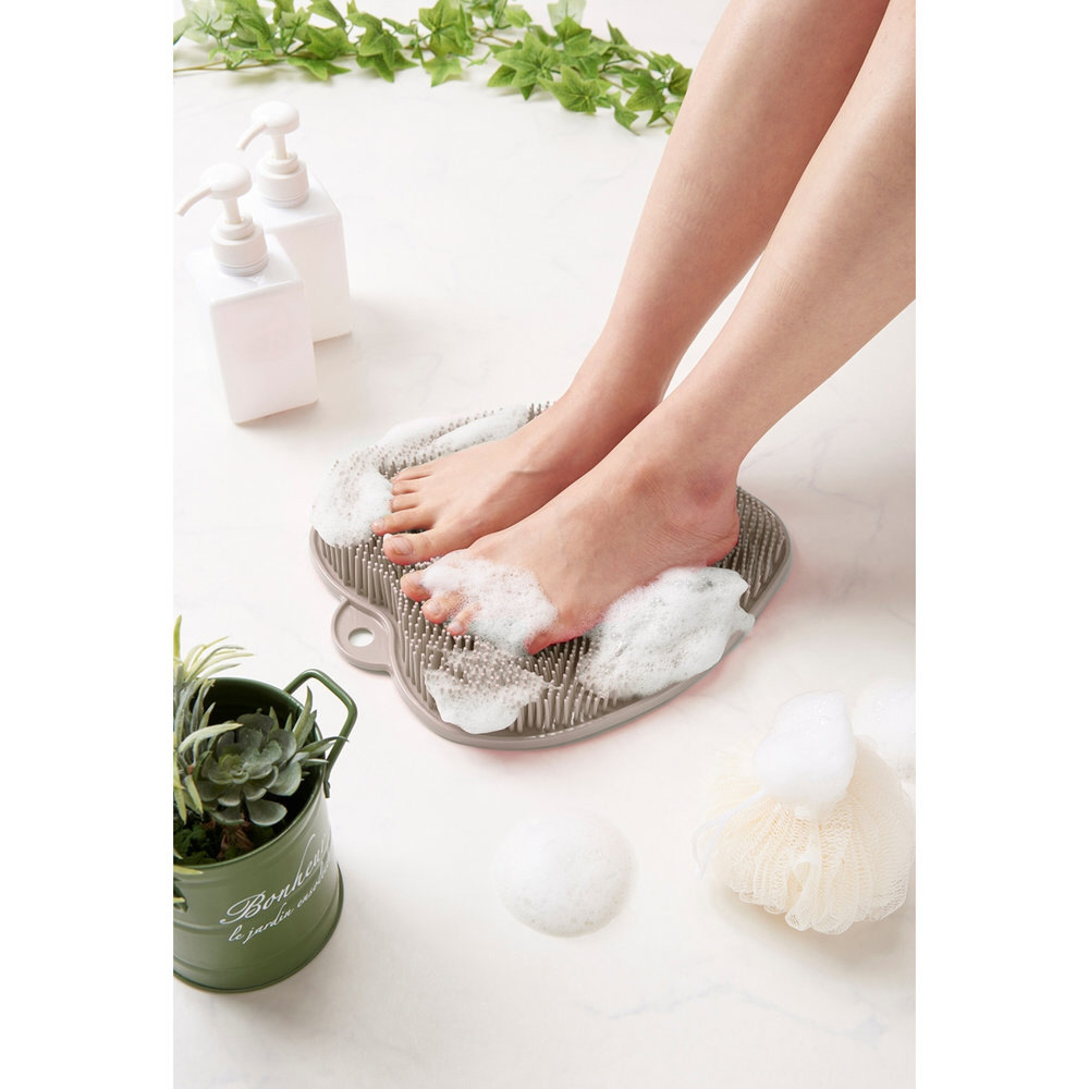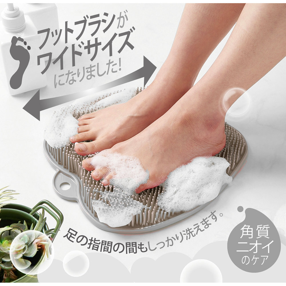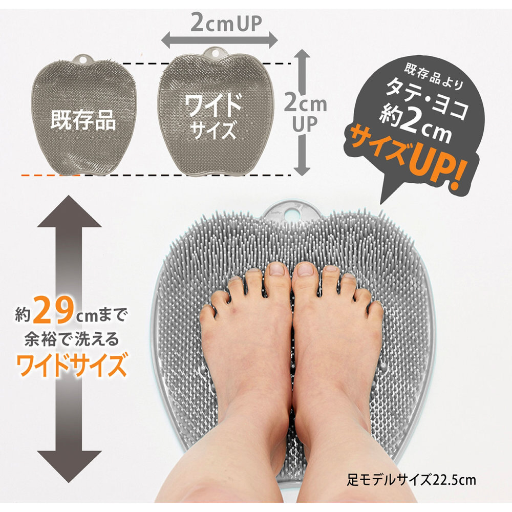 従来品より縦横ワイドに。ソープを泡立てて足を前後に動かすだけで足裏を気持ちよく刺激しながら洗えます。長さの違うブラシが足の指先までしっかりっと入り込み洗えます。