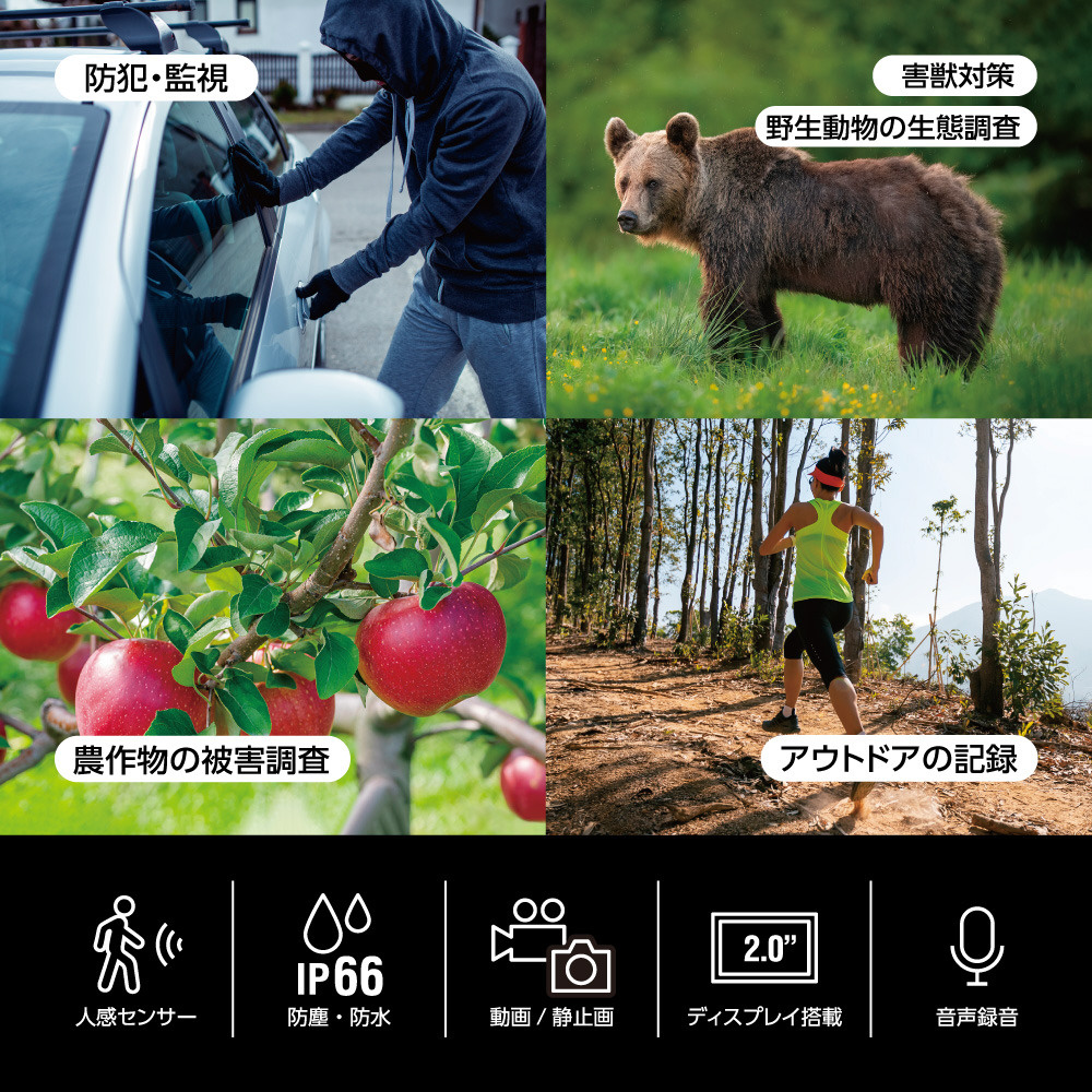 ●一体型のソーラーパネルに内蔵の2600mAhリチウム電池で長時間の待ち受けに対応。※最長目安約6か月 外部電源が不要なので電源が取れない駐車場や庭、倉庫などの監視に最適。不審者の侵入やいたずらの証拠を記録。 ●ソーラー・内蔵バッテリーの他に単3形アルカリ乾電池4本でも動作します。悪天候が続いた時や日照時間が少ないときでも記録を取り続けます。 リチウム充電池が苦手な低温時でも乾電池なら作動可能です。※内蔵リチウムバッテリーの容量が少なくなると自動的に乾電池に切り替わります。
