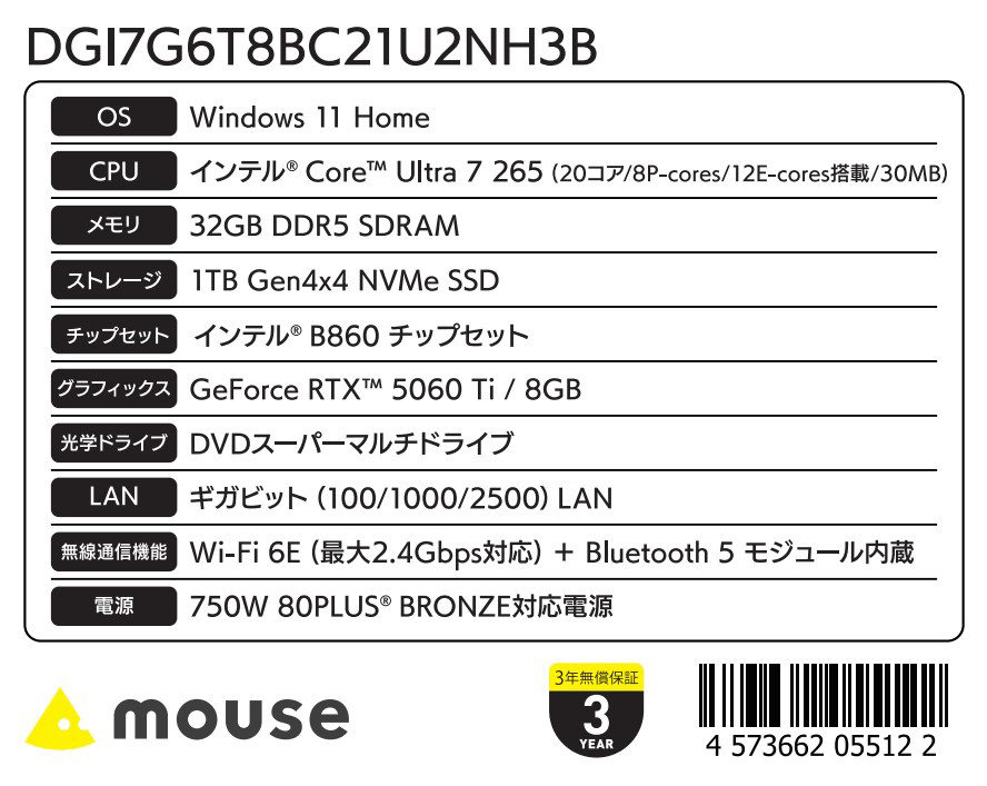 GeForce RTX 5060Ti (8GB) グラフィックス・Core Ultra 7搭載でオールラウンドに活躍するミドルクラスゲーミングデスクPC