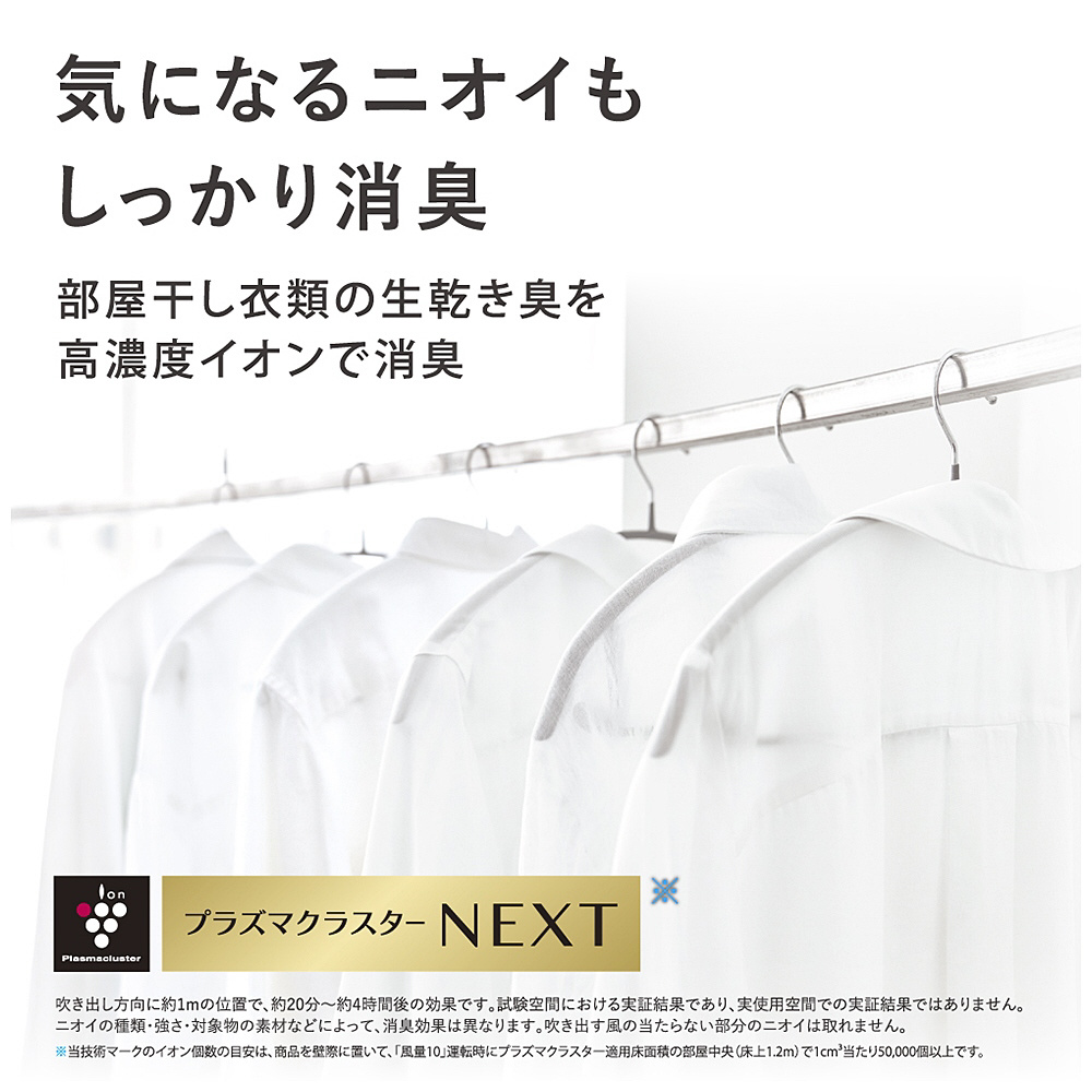 高濃度プラズマクラスターイオンの風は、部屋干しの生乾きのニオイを消臭するなど高い空気浄化力を発揮します。