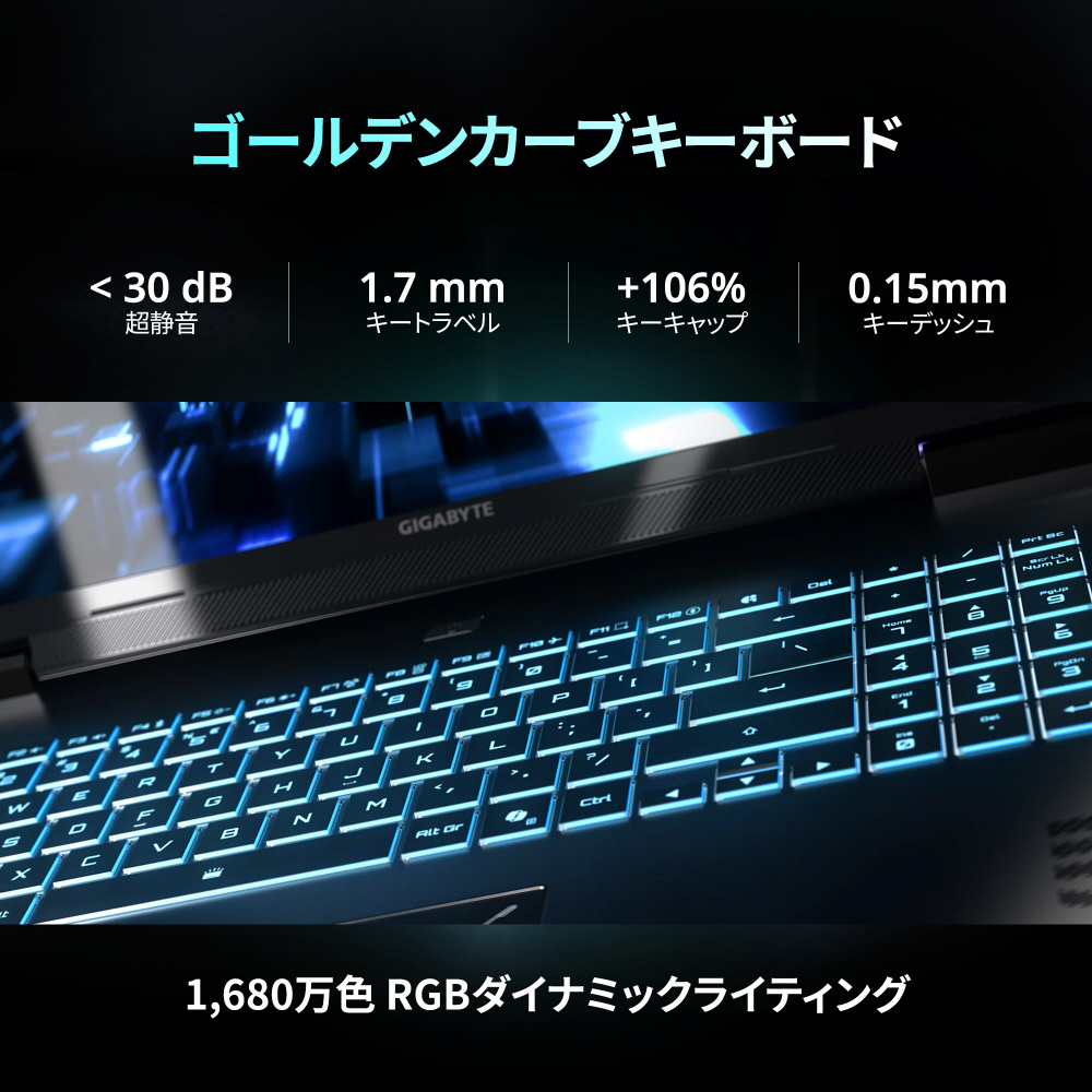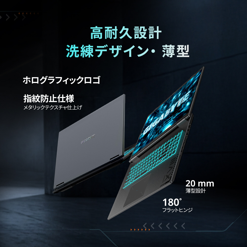GIGABYTE独自の「WINDFORCE Infinity EX」冷却システムは、超薄型ブレードファン×ヒートパイプ×4排気口の組み合わせで構成され、高性能CPUやGPUの熱を効率的に分散。ゲーム中の長時間高負荷でも、システム温度を安定的に制御し、静音性も両立。エアフローを最大限に活かした設計で、薄型筐体でも驚きの冷却性能を実現しています。