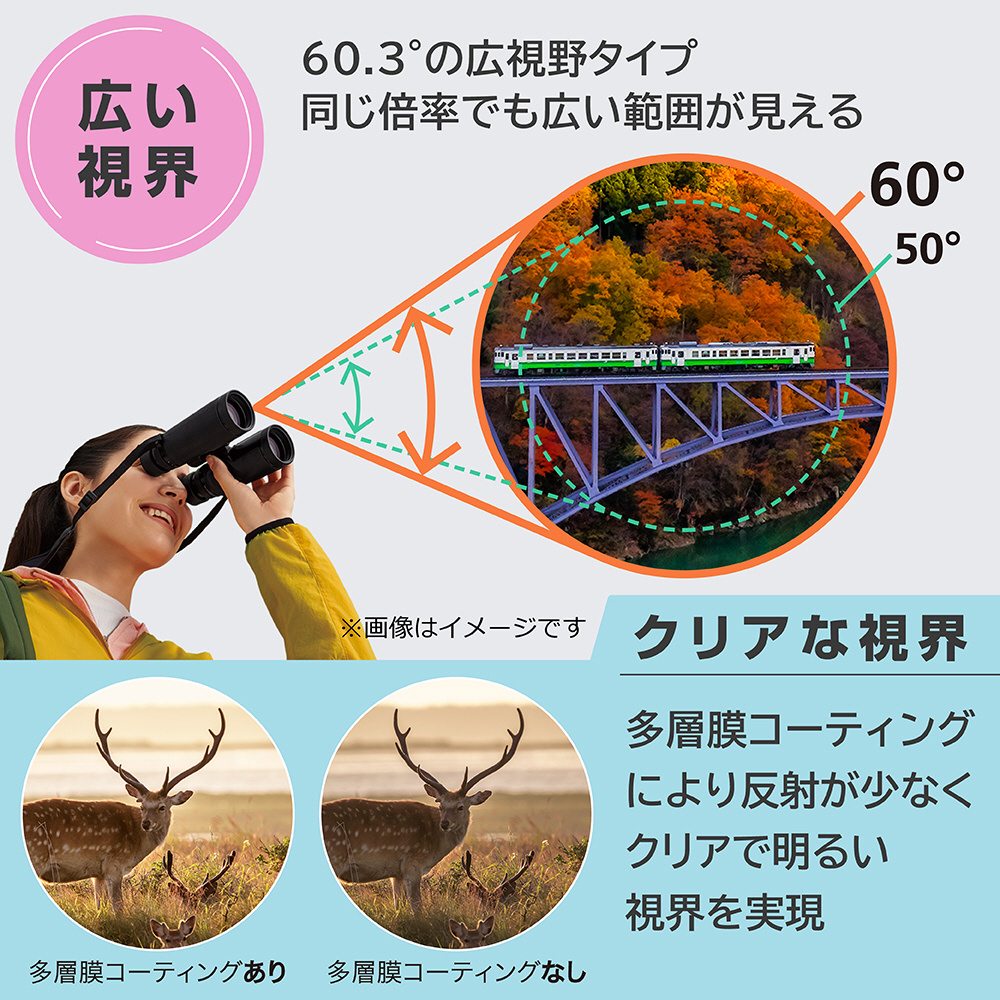 広い範囲を見渡すことができ、動きのある対象物を捉えやすく、長時間の観察でも疲れが出にくいモデルです。