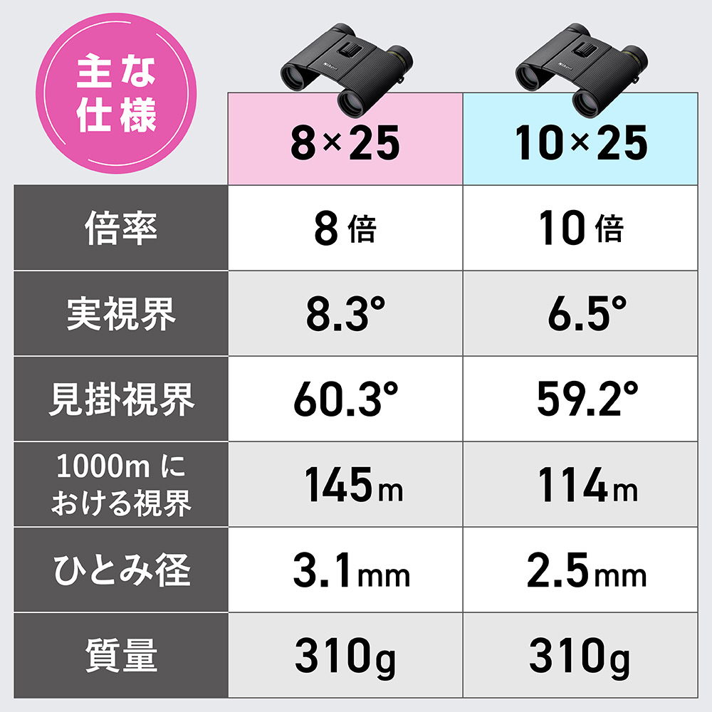 8×25は見掛け視界 60.3°の広視界タイプで、臨場感あふれる観察体験を可能にします。