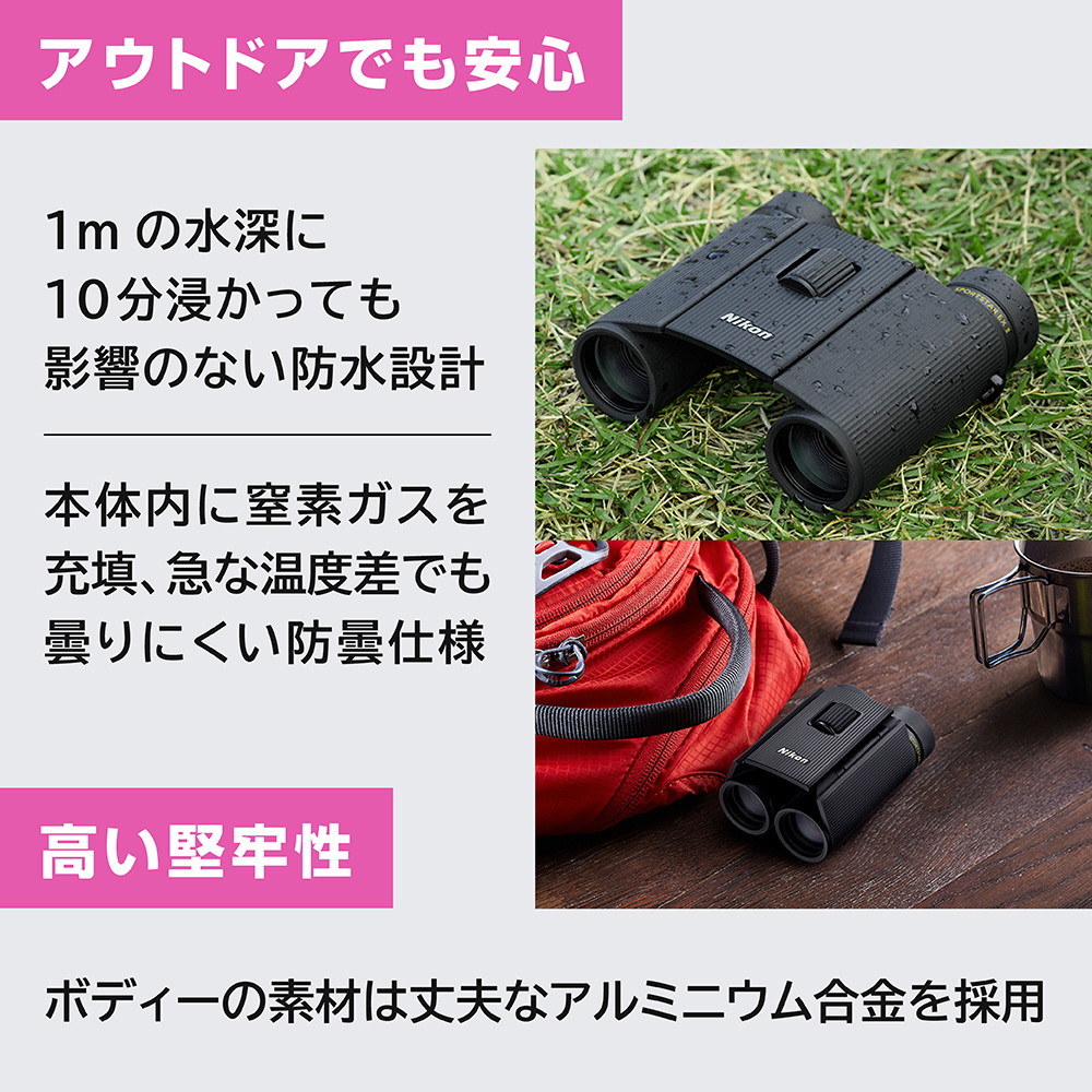 本体内部に窒素ガスを充填した本格的な防水仕様により、天候を気にせず、アウトドアでも安心して使用いただけます。また、急な温度変化でも曇りにくい防曇構造を備えています。