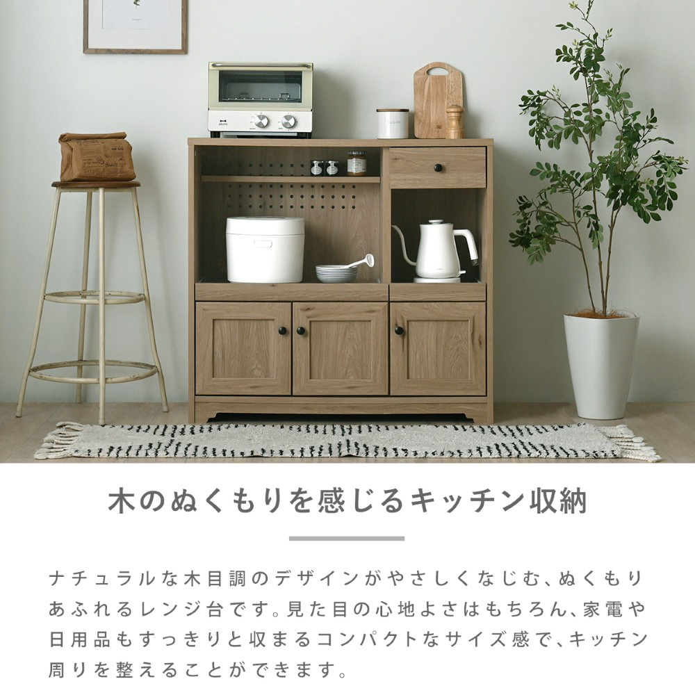 木のぬくもりを感じるキッチン収納ナチュラルな木目調のデザインがやさしくなじむ、ぬくもりあふれるレンジ台です。見た目の心地よさはもちろん、家電や日用品もすっきりと収まるコンパクトなサイズ感で、キッチン周りを整えることができます。