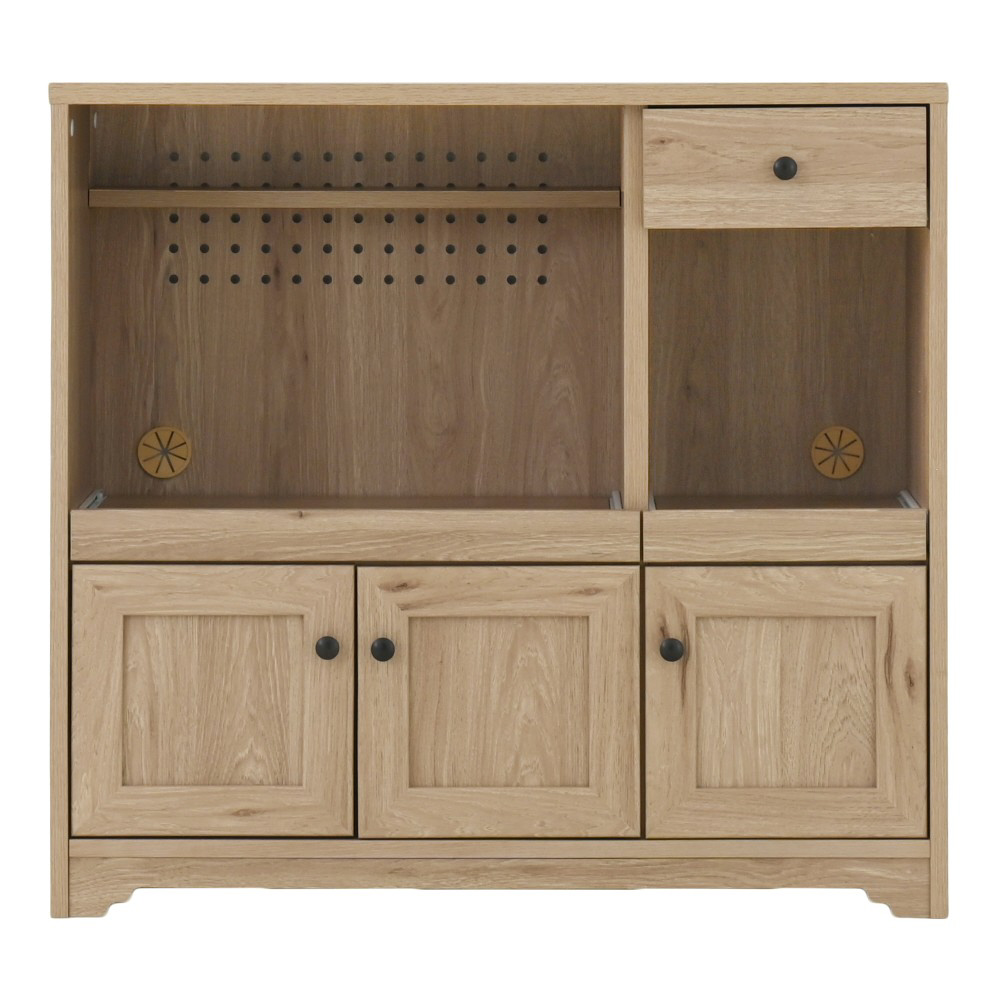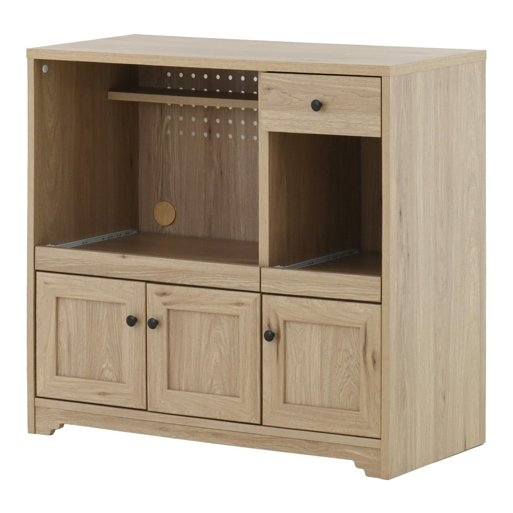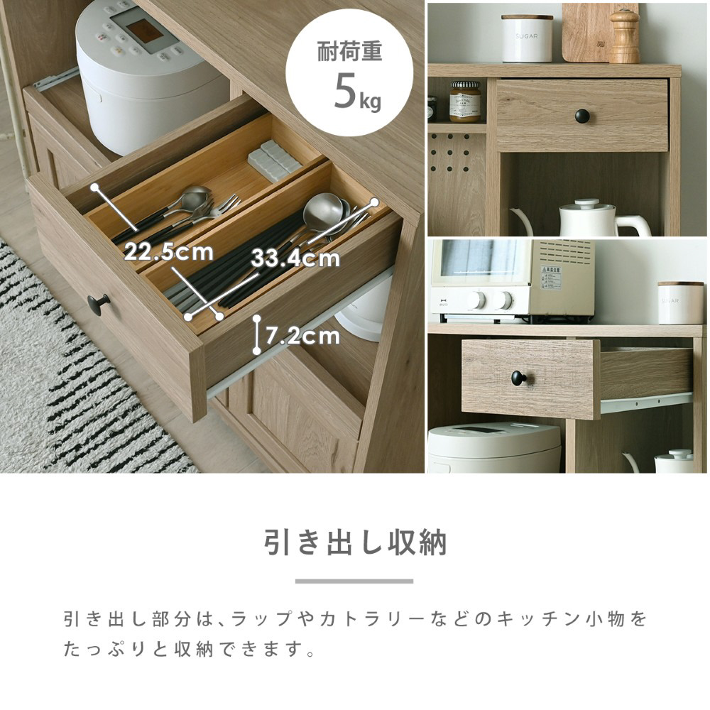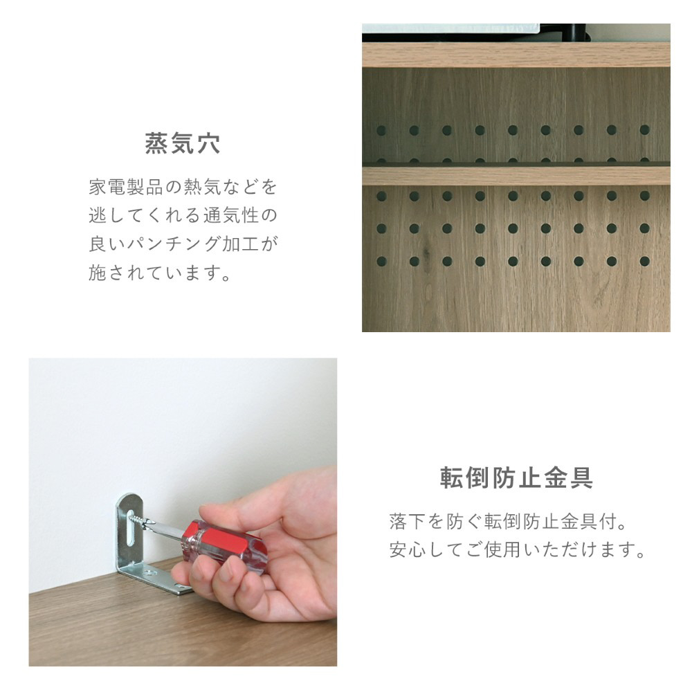 ナチュラルな木目調のデザインがやさしくなじむ、ぬくもりあふれるレンジ台です。見た目の心地よさはもちろん、家電や日用品もすっきりと収まるコンパクトなサイズ感で、キッチン周りを整えることができます。