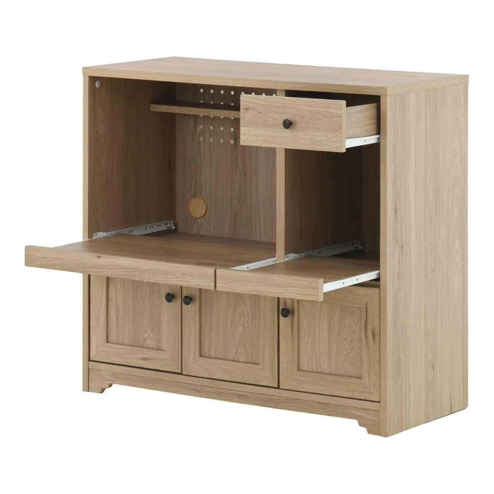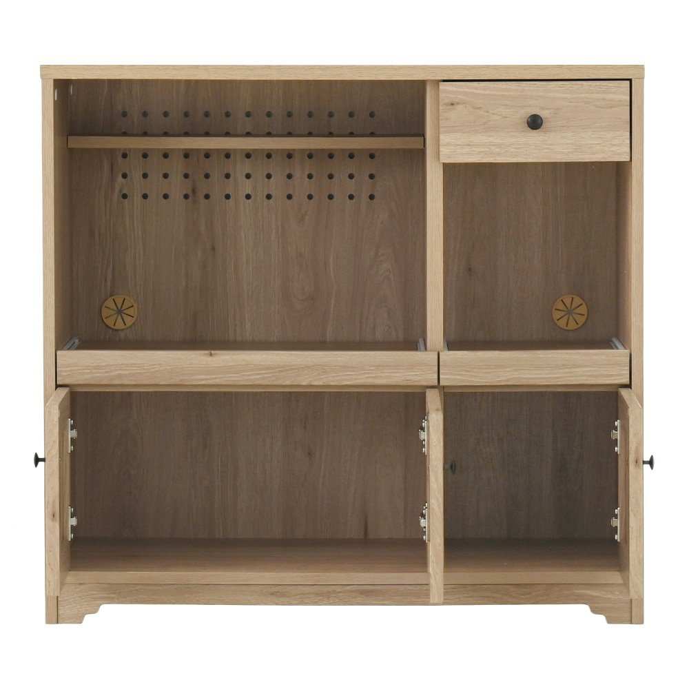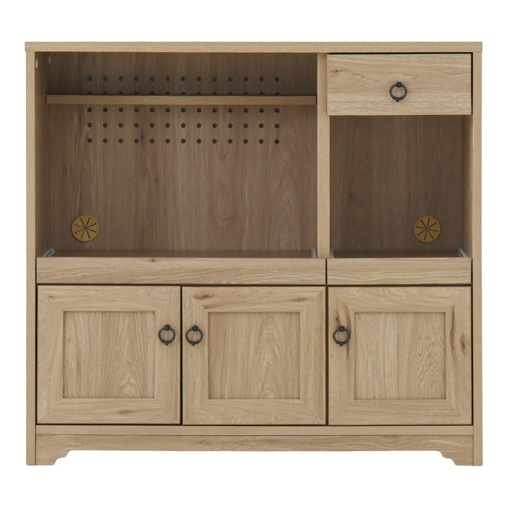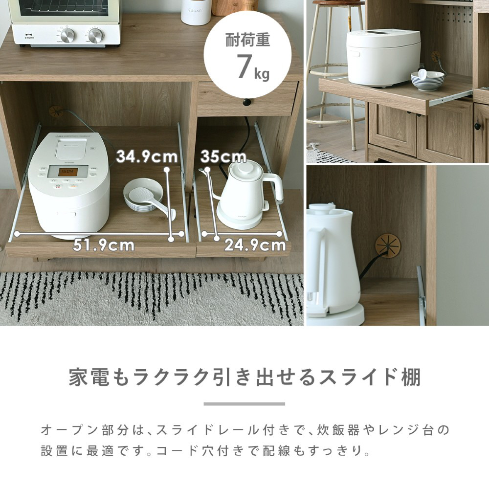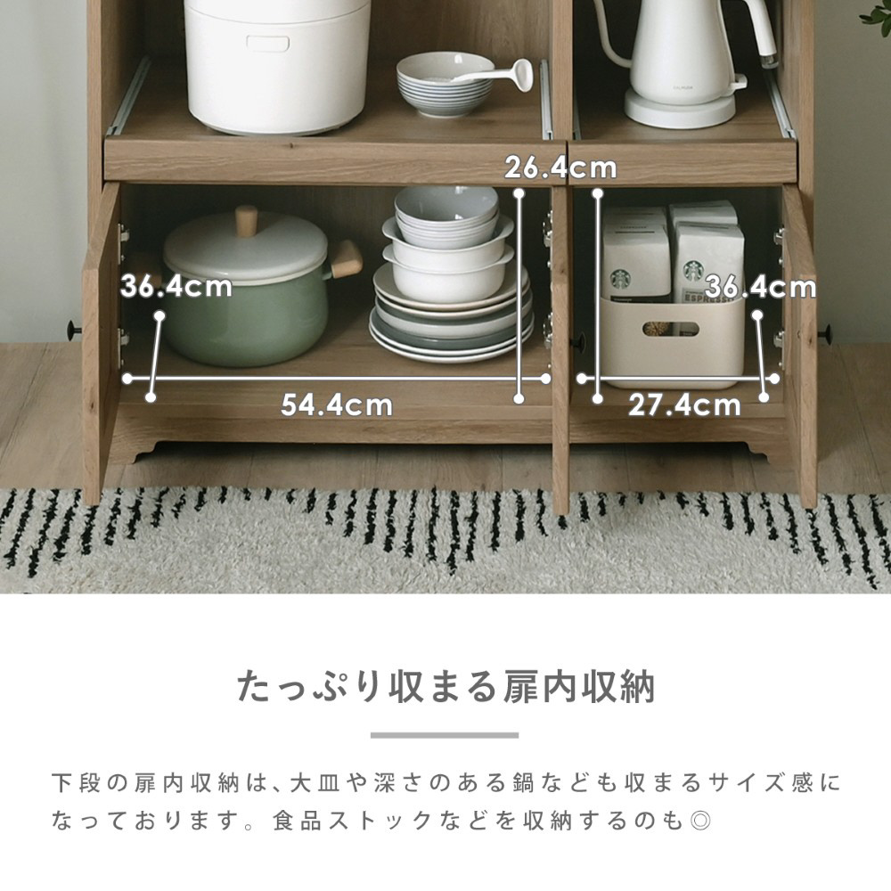 ナチュラルな木目調のデザインがやさしくなじむ、ぬくもりあふれるレンジ台です。見た目の心地よさはもちろん、家電や日用品もすっきりと収まるコンパクトなサイズ感で、キッチン周りを整えることができます。
