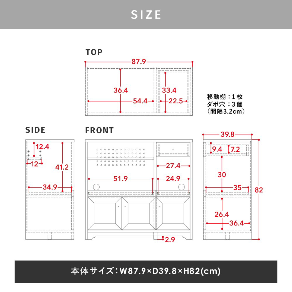 天板は幅87.9cm×奥行き39.8cmと、作業スペースとしてもしっかり使えるサイズ感です。食材を広げたり、調理器具を仮置きしたりと、食事の準備やちょっとした家事がスムーズに行えます。