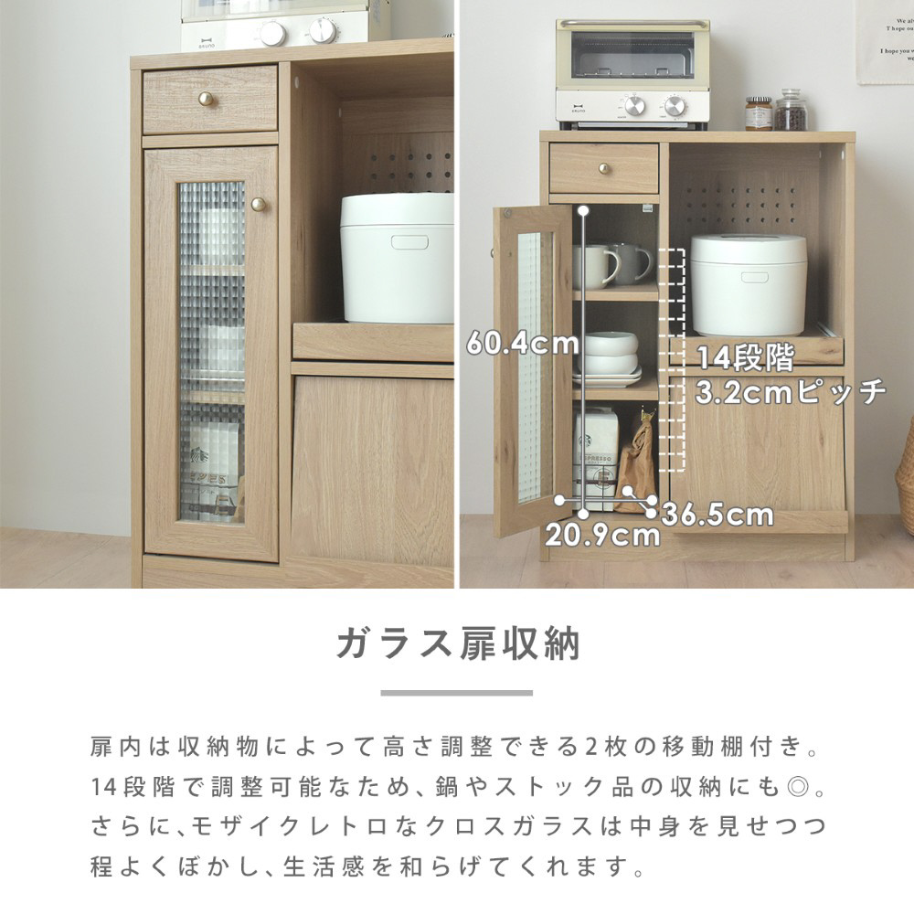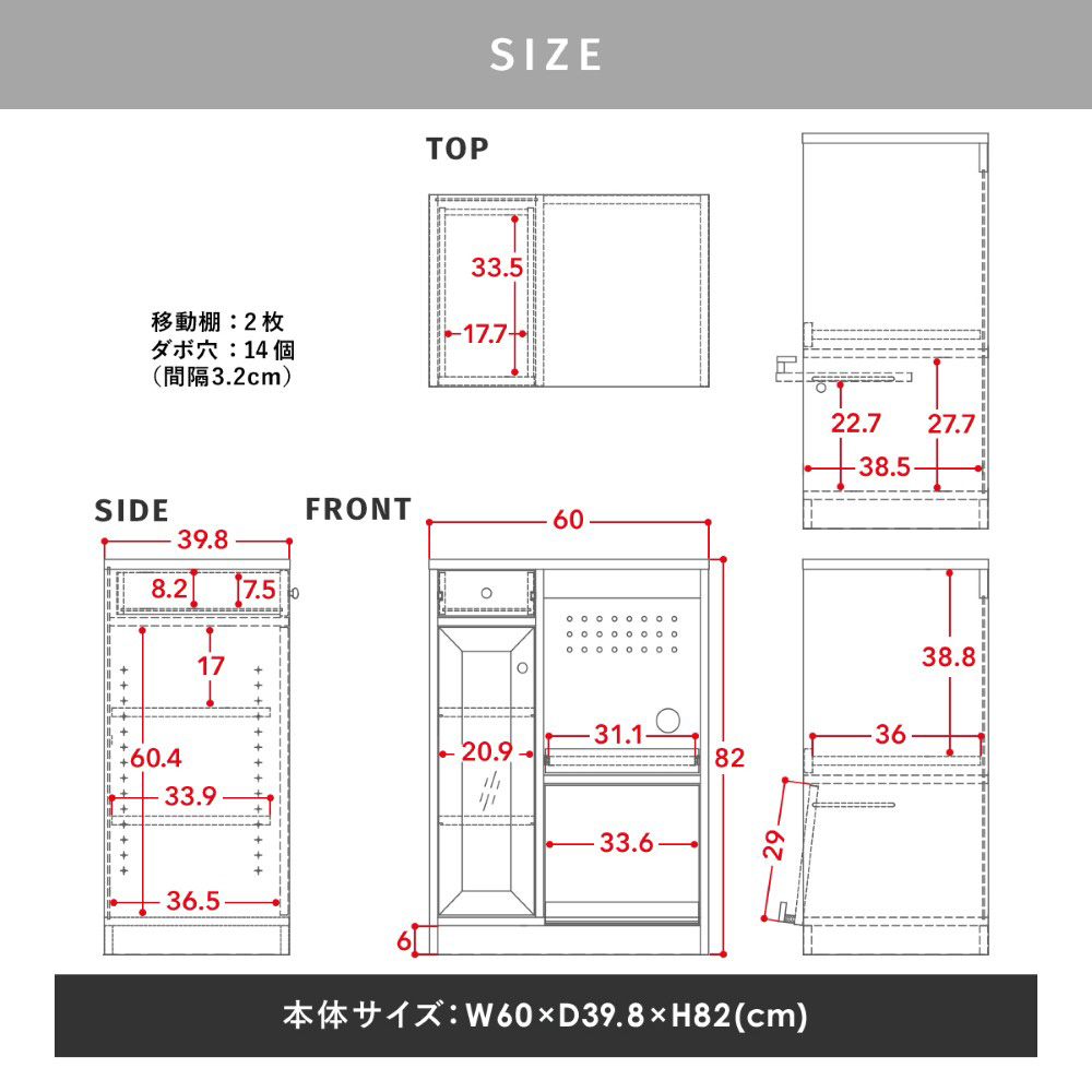 コンパクトながらも抜群の収納力幅60cm×高さ82cmというコンパクト設計ながらも抜群の収納力を誇るレンジボード。スペースに余裕のないワンルームなどでもすっきり置けて、デザインも使い勝手も抜群な一台です。