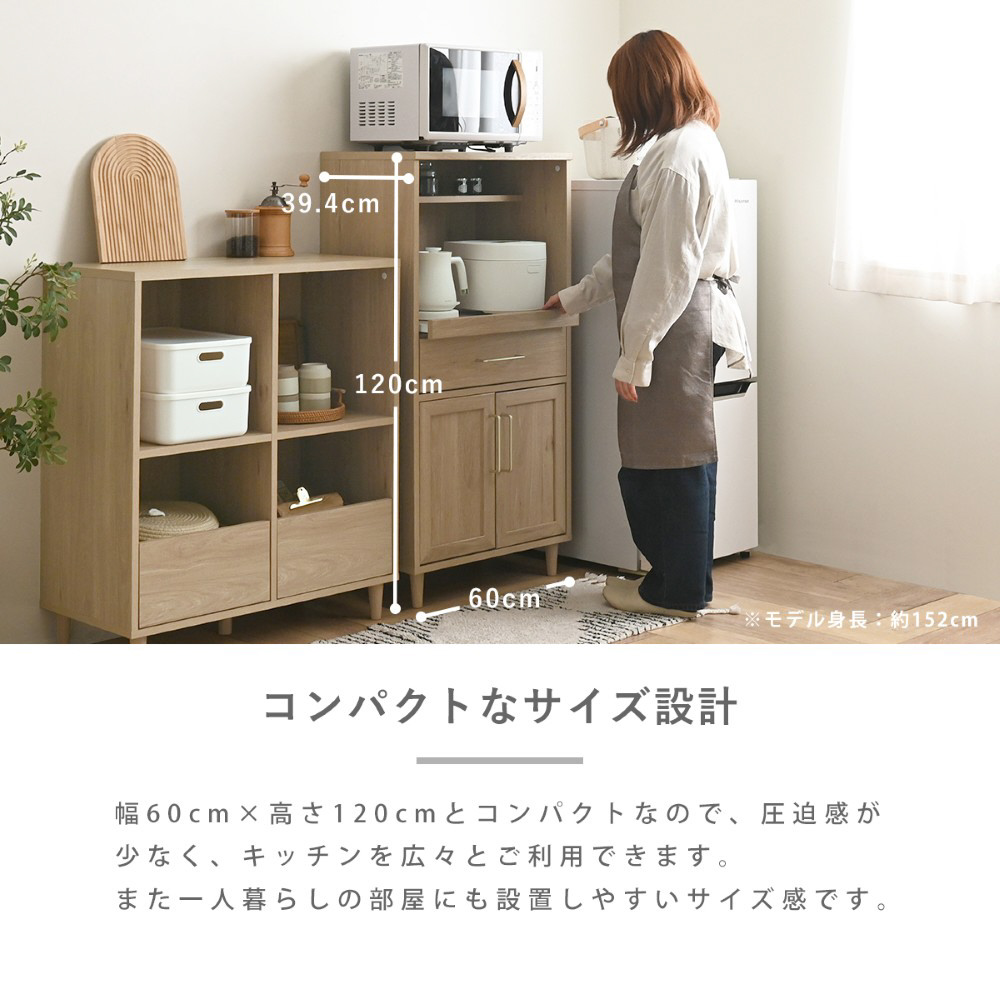 幅60cm×高さ120cmとコンパクトなので、圧迫感が少なく、キッチンを広々とご利用できます。また一人暮らしの部屋にも設置しやすいサイズ感です。