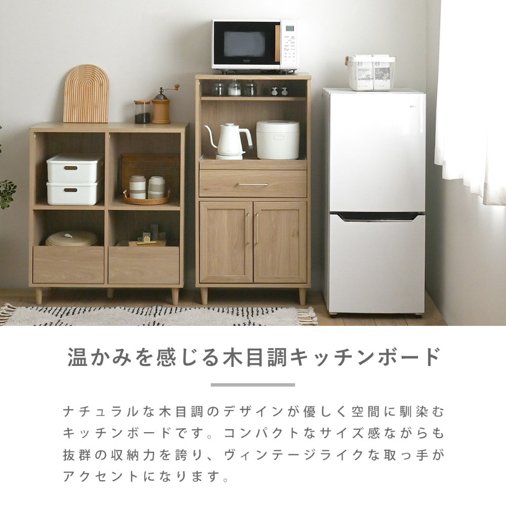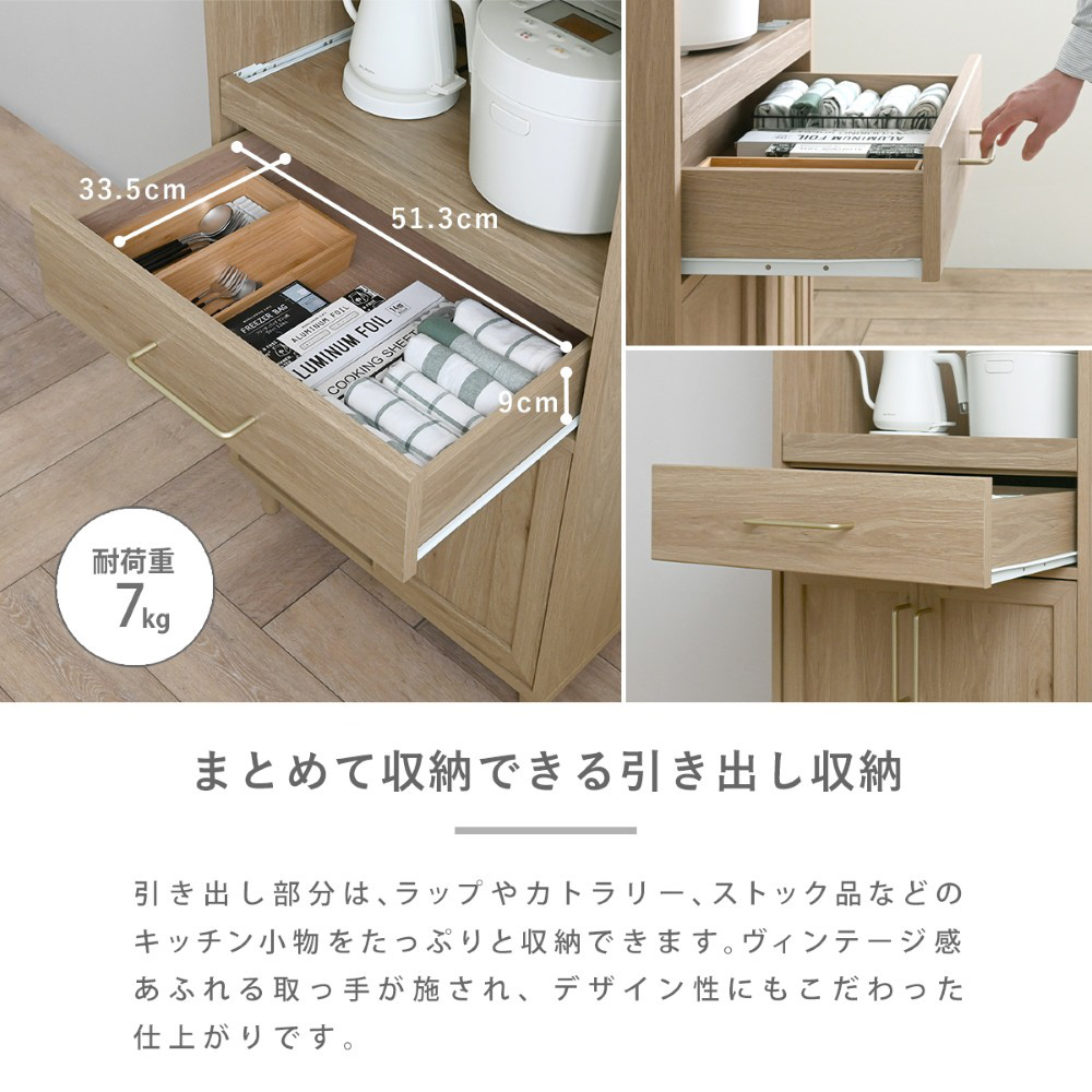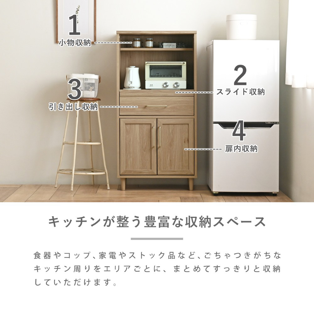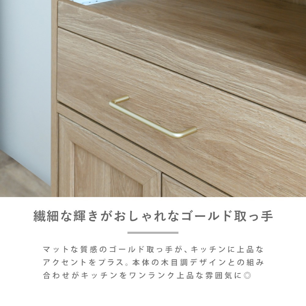オープン部分はスライドレール付きで、炊飯器やレンジの設置に最適です。上部には、スパイスや調味料を収納するのにぴったりなディスプレイ棚があり、コード穴付きで配線もすっきり◎