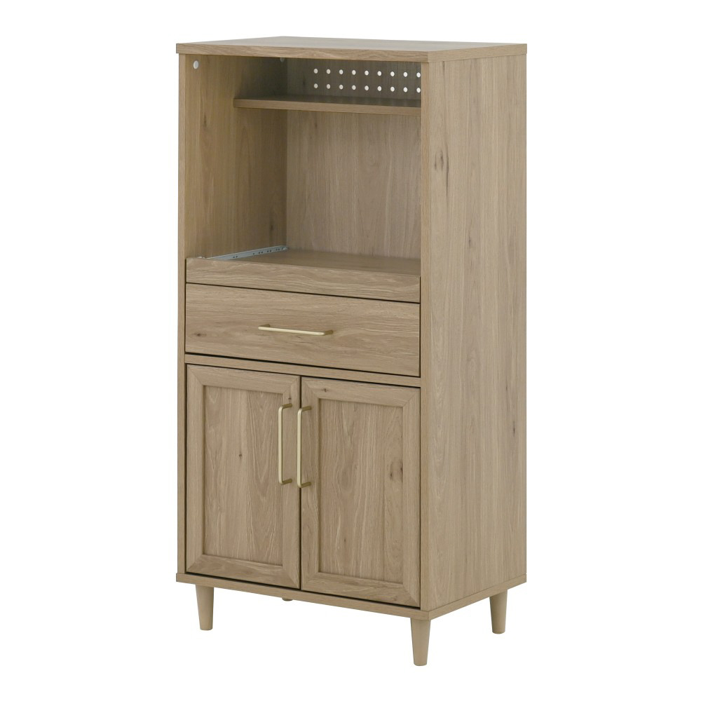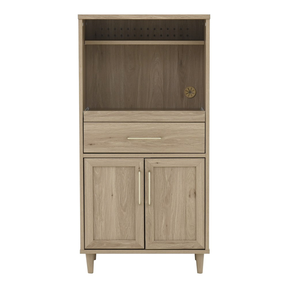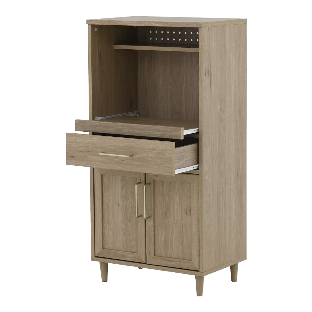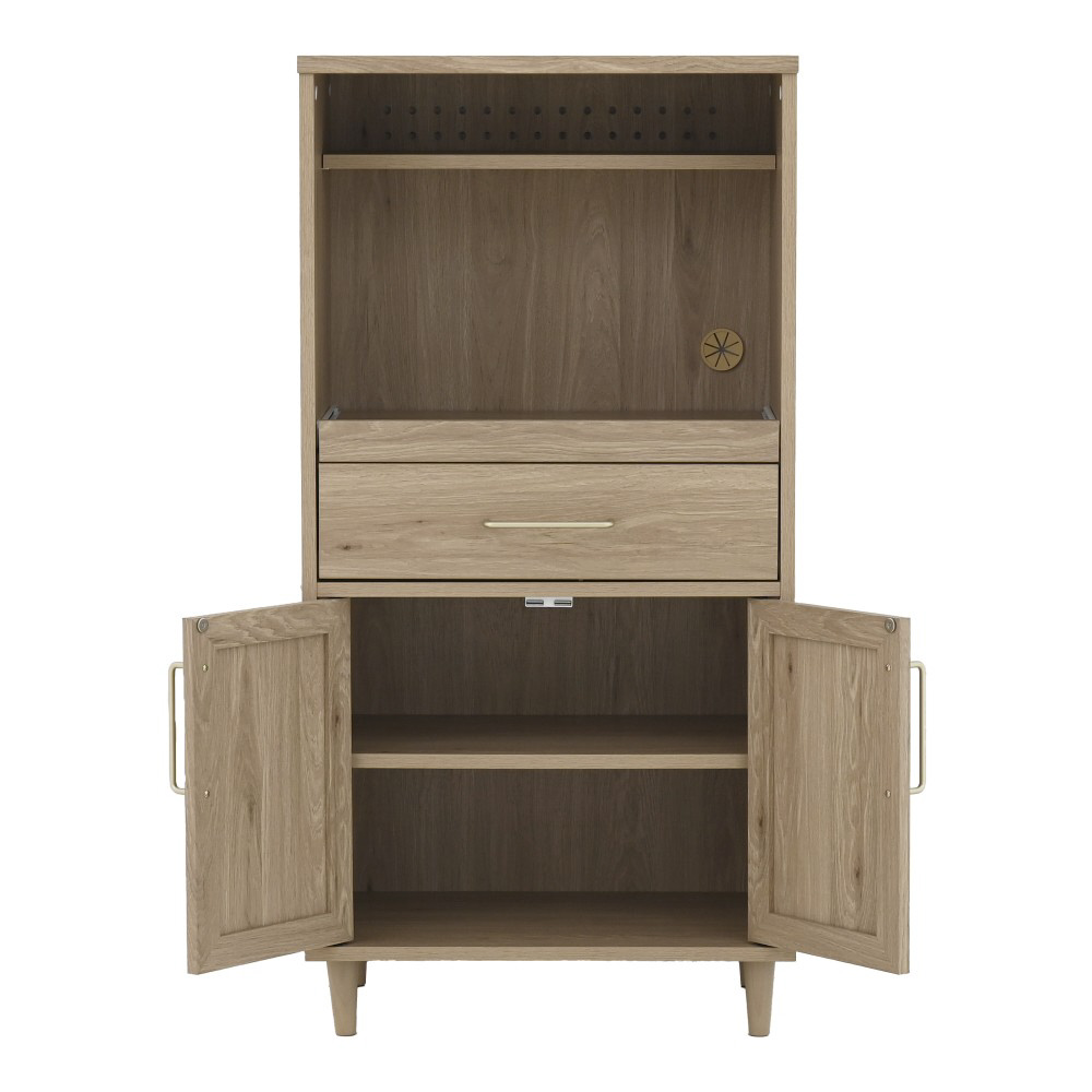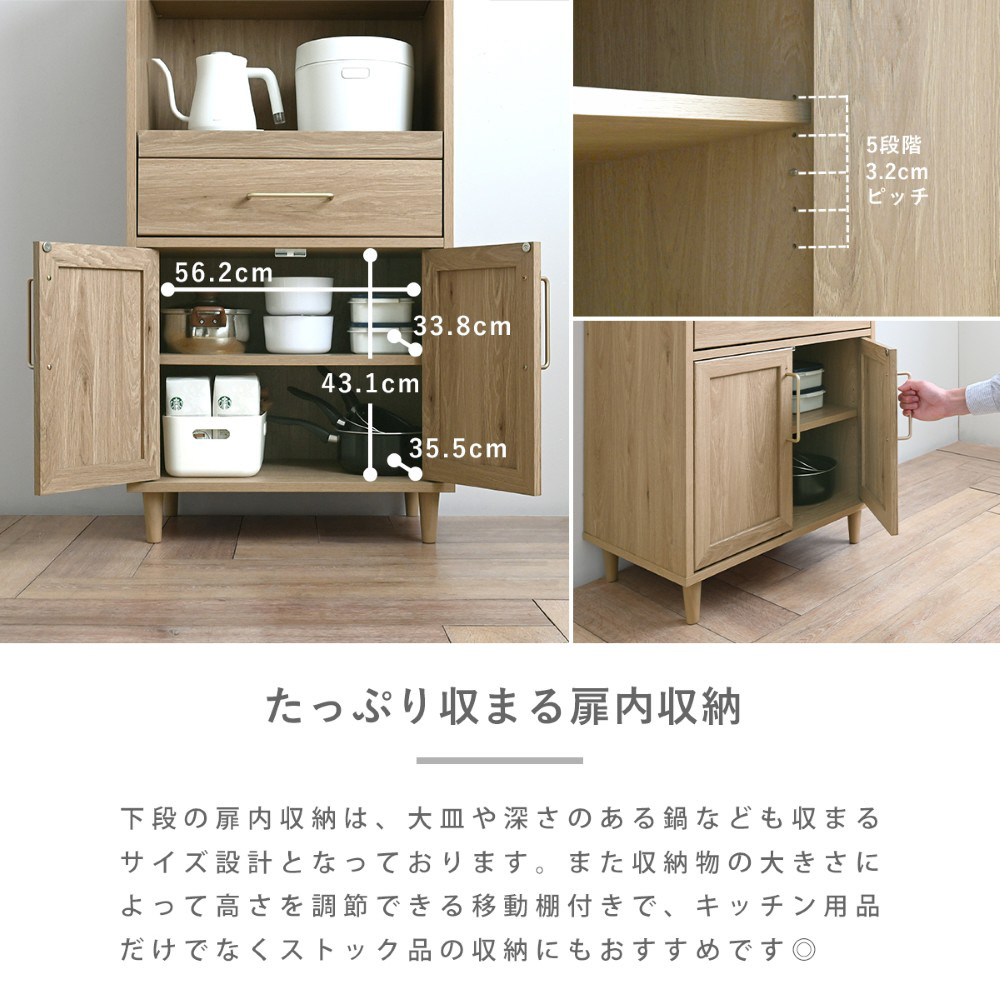 オープン部分はスライドレール付きで、炊飯器やレンジの設置に最適です。上部には、スパイスや調味料を収納するのにぴったりなディスプレイ棚があり、コード穴付きで配線もすっきり◎