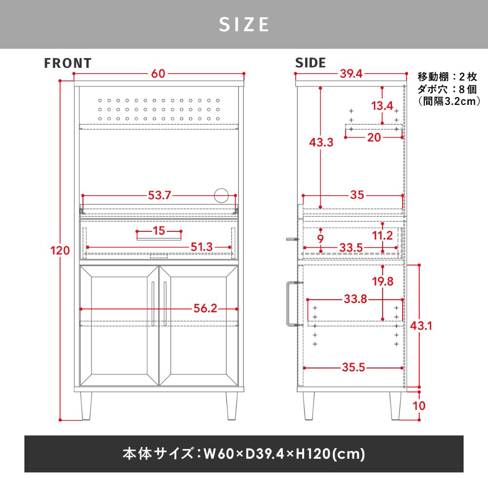 コンパクトなサイズ設計幅60cm×高さ120cmとコンパクトなので、圧迫感が少なく、キッチンを広々とご利用できます。また一人暮らしの部屋にも設置しやすいサイズ感です。