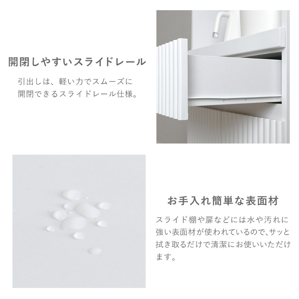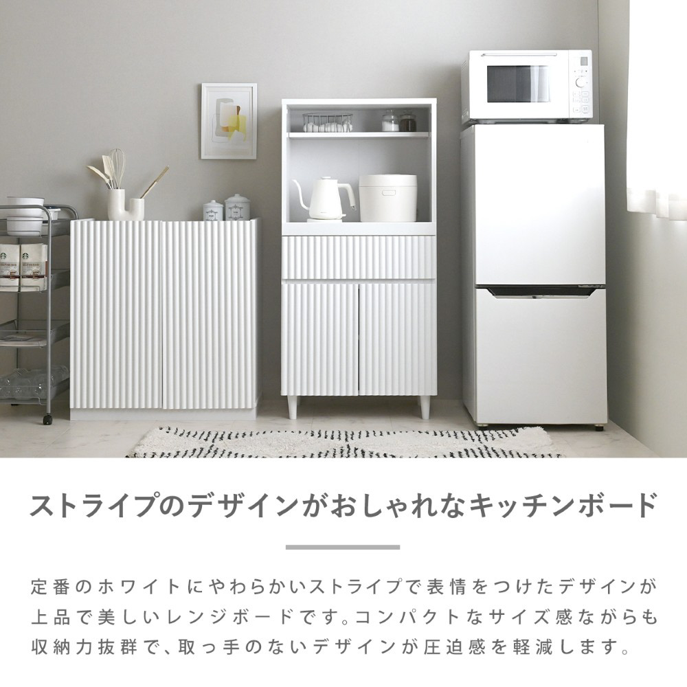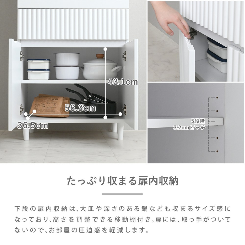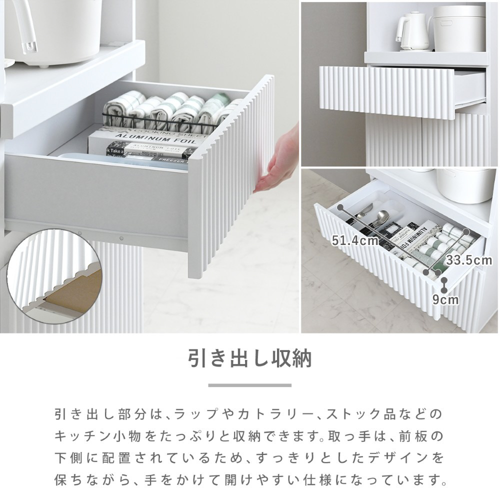 波板デザインがおしゃれなキッチンボード扉や引き出しに採用している波板の優しい陰影がお部屋をスタイリッシュに。コンパクトなサイズ感ながら収納力が抜群で、取っ手のないデザインが圧迫感を軽減します。