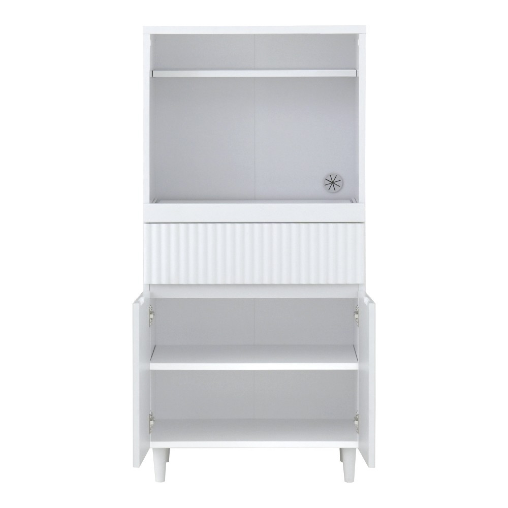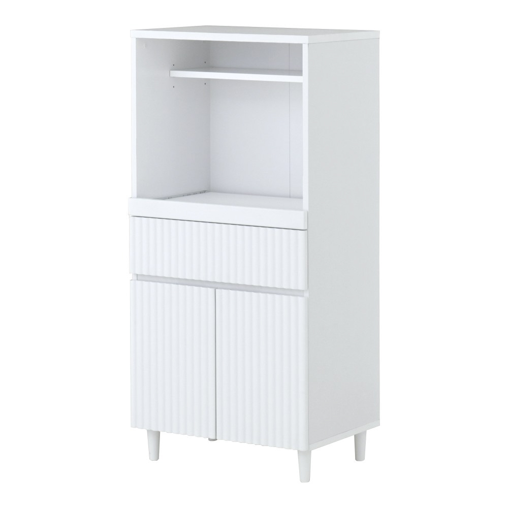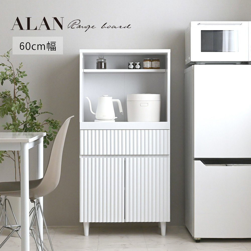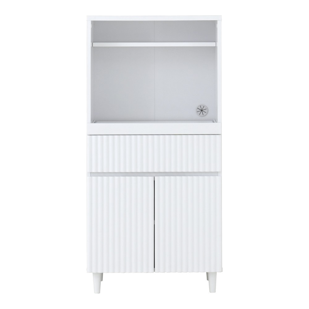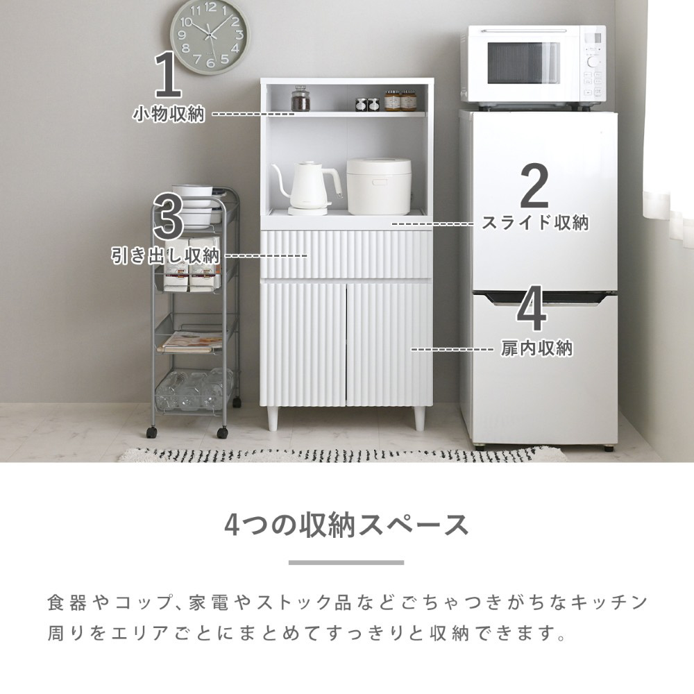 波板デザインがおしゃれなキッチンボード扉や引き出しに採用している波板の優しい陰影がお部屋をスタイリッシュに。コンパクトなサイズ感ながら収納力が抜群で、取っ手のないデザインが圧迫感を軽減します。