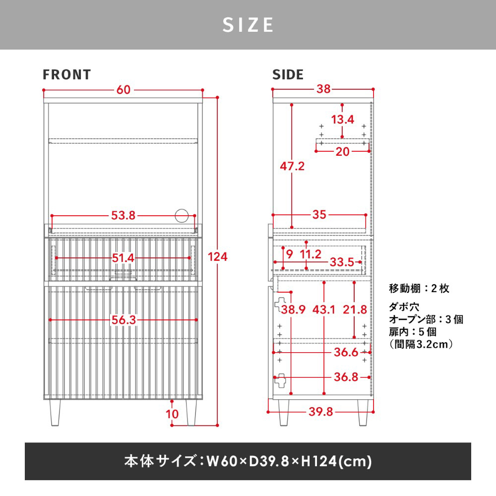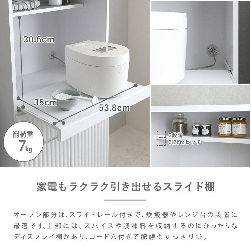 オープン部分はスライドレール付きで、炊飯器やレンジの設置に最適です。上部には、スパイスや調味料を収納するのにぴったりなディスプレイ棚があり、コード穴付きで配線もすっきり◎