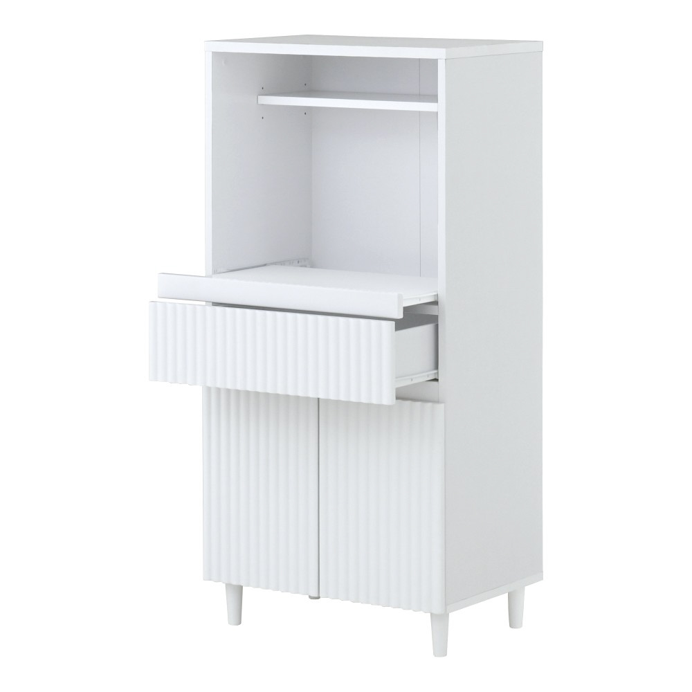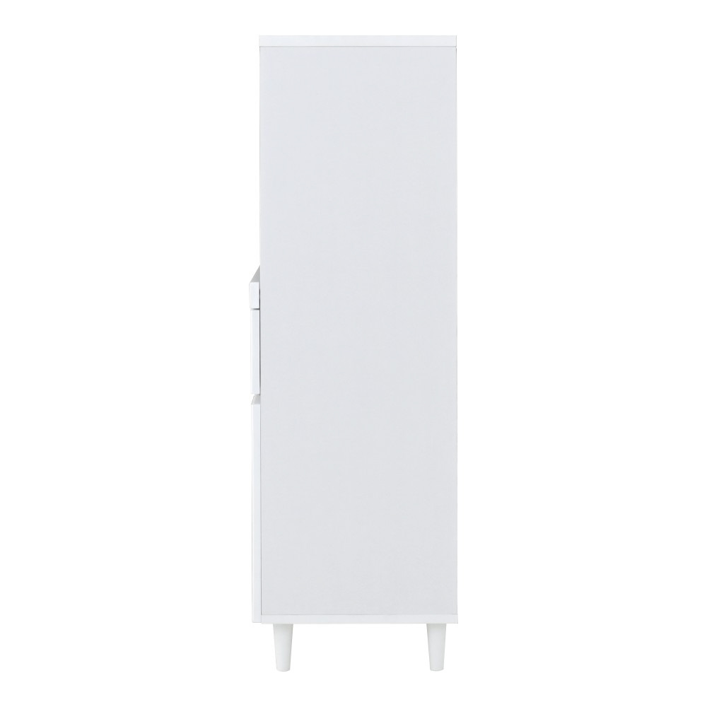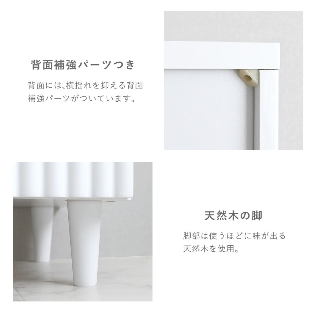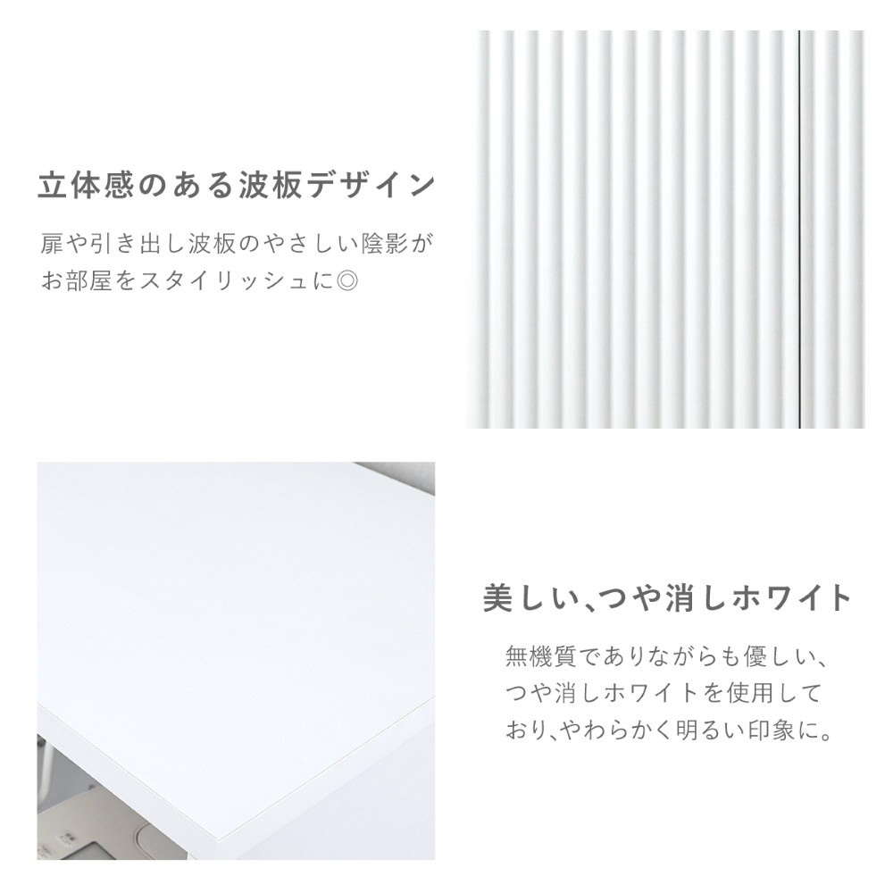 扉や引き出しに採用している波板の優しい陰影がお部屋をスタイリッシュに。コンパクトなサイズ感ながら収納力が抜群で、取っ手のないデザインが圧迫感を軽減します。