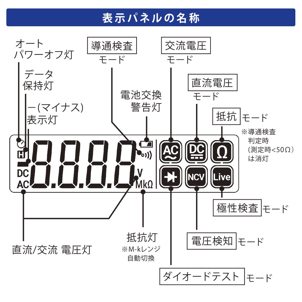 ■ 本体機能:直流電圧、交流電圧、抵抗、導通検査、ダイオード、電圧検知(NCV)、極性検査(ニュートラル/ライブ)