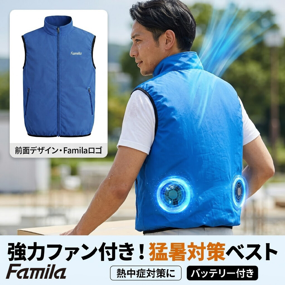 熱中症対策は“努力”から“義務”へ。着るだけ熱中症対策のクールファンベスト。直径約10cmの大きな電動ファンです。