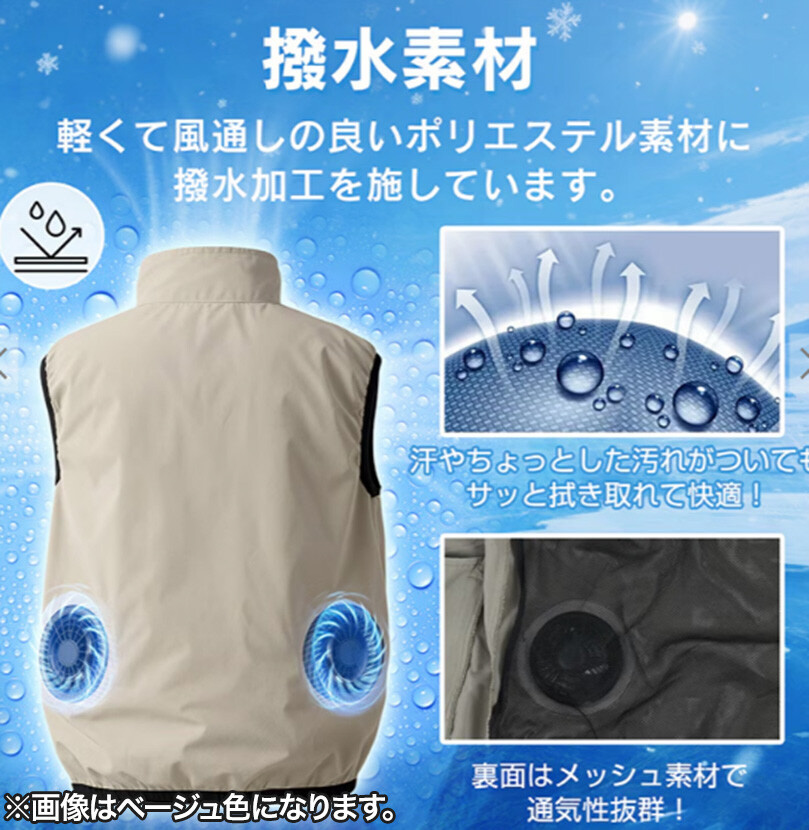 ●素材/ベスト:ポリエステル・ナイロン、ファンユニット:ABS、モバイルバッテリー:ABS・リチウムイオンポリマー