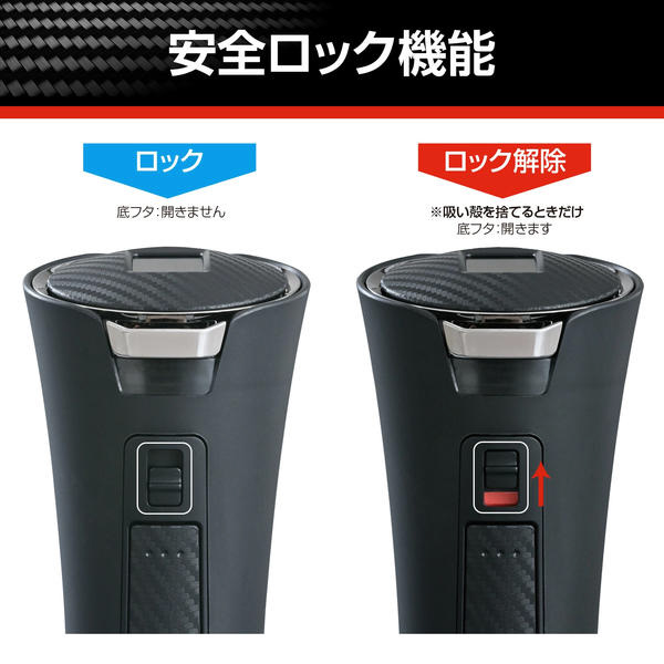 ●安全ロックを解除すると底フタがワンプッシュで開き、吸い殻を簡単に捨てられます。