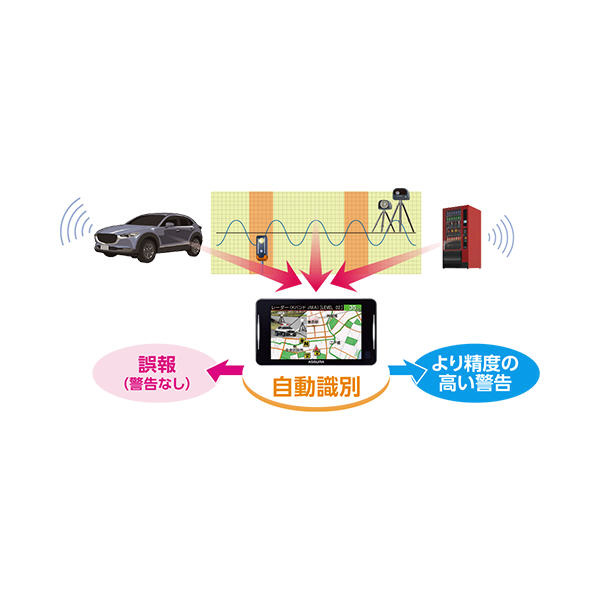 自動販売機や特定の車種などから発せられる電波の特徴を捉えてフィルタリングし、取締機の疑いのあるレーダー波だけを警告します。
