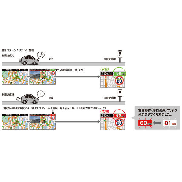 インテリジェント安全運転評価機能は、現在の走行速度(走行状態)が安全か危険を判断し、場所、時間によって最適な警告動作に変化します。