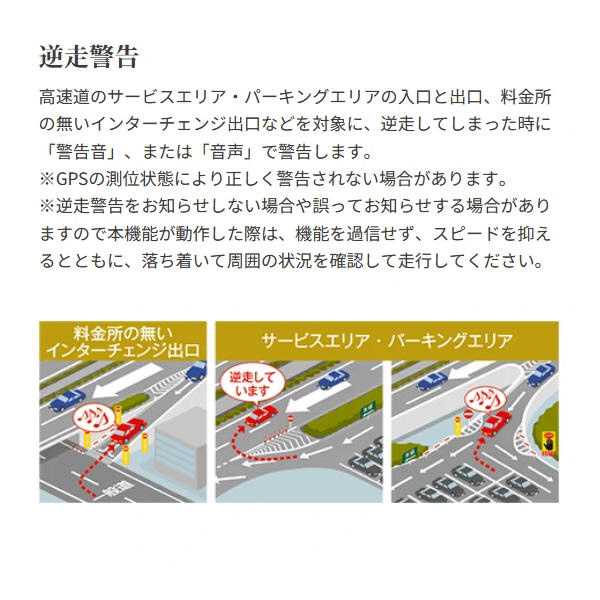 高速道のサービスエリア・パーキングエリアの入口と出口、料金所の無いインターチェンジ出口などを対象に、逆走してしまった時に「警告音」、または「音声」で警告します。