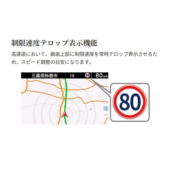 高速道において、画面上部に制限速度を常時テロップ表示させるため、スピード調整の目安になります。